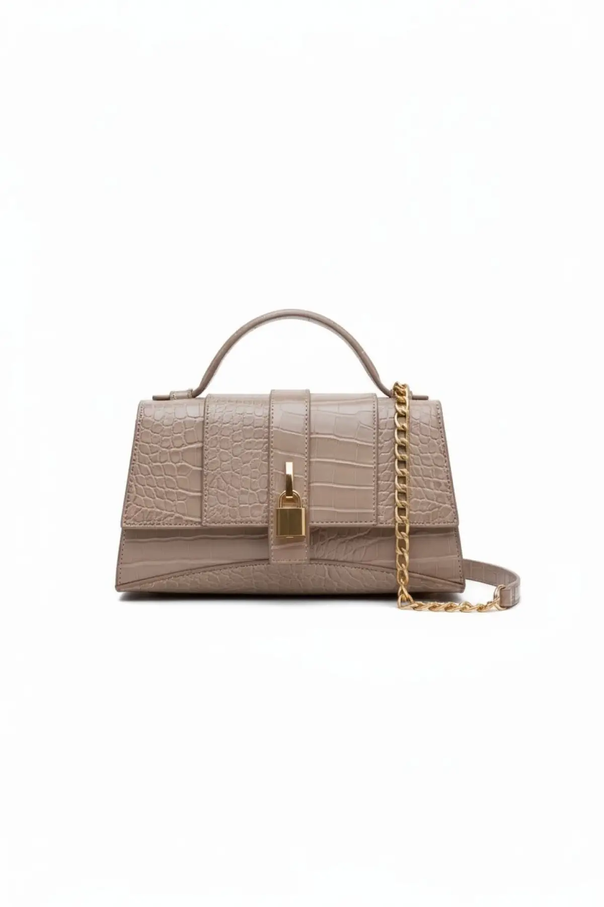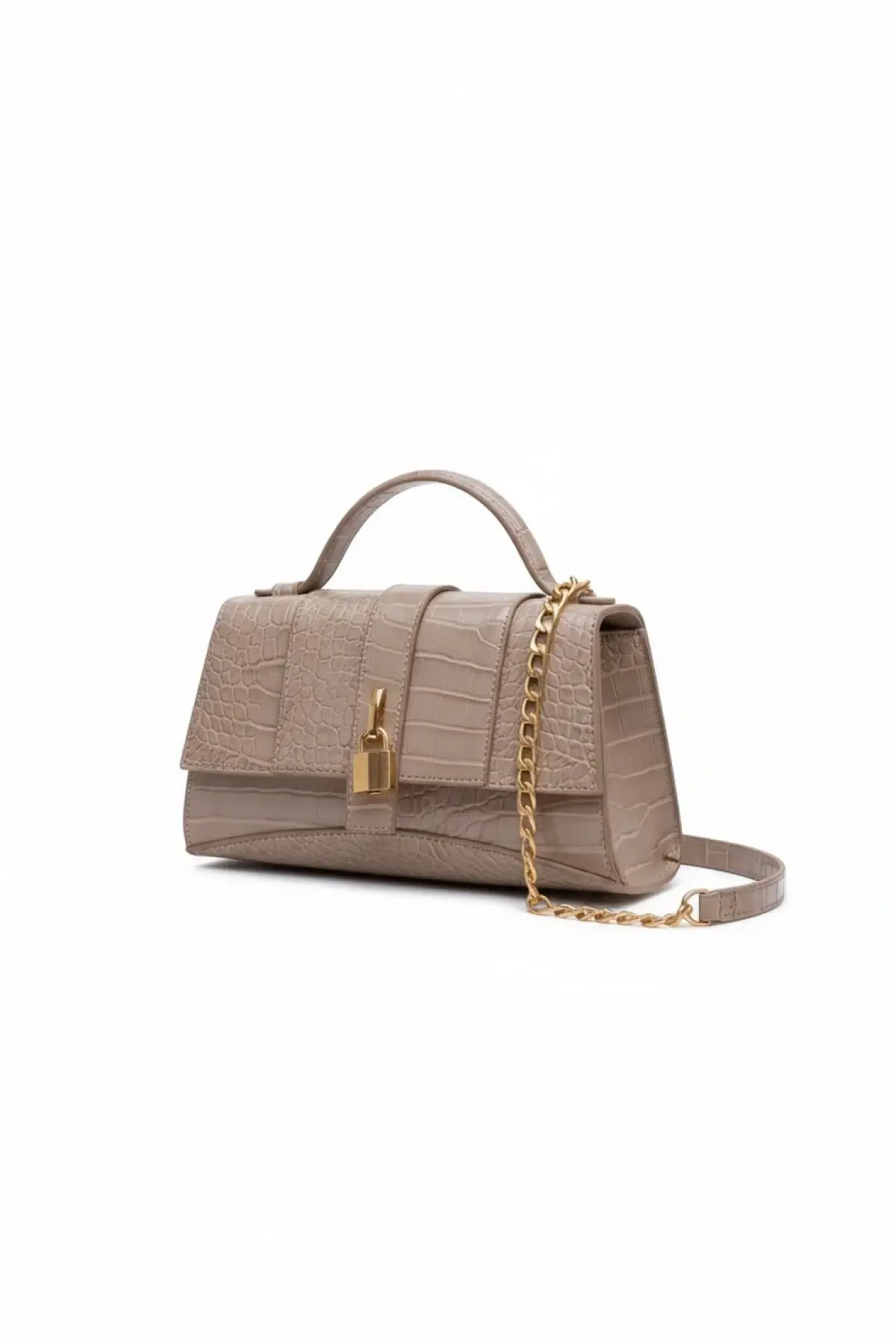 Bahus Kilit Aksesuarlı Zincir Askılı Kroko Desen Koyu Vizon Kroko Trend Kadın El Ve Omuz Çantası