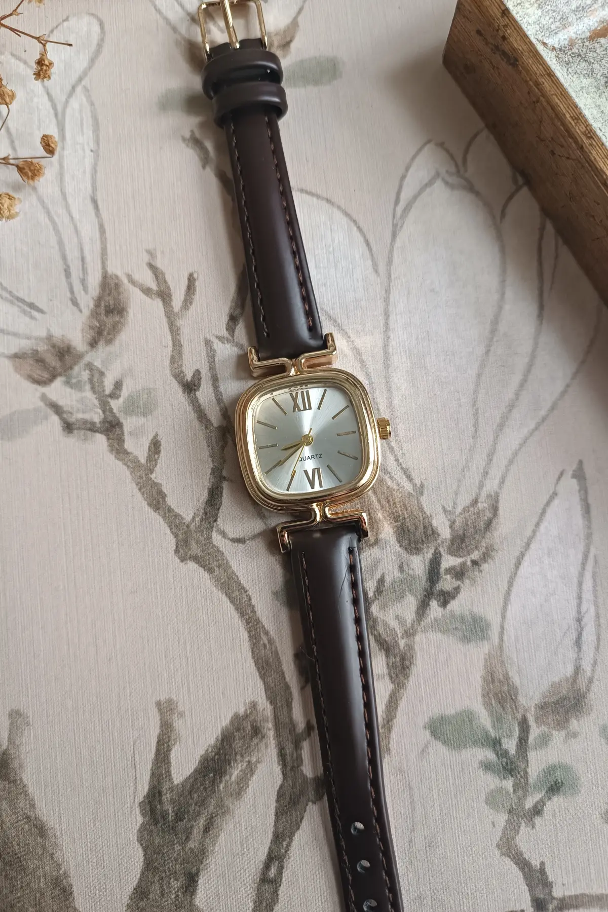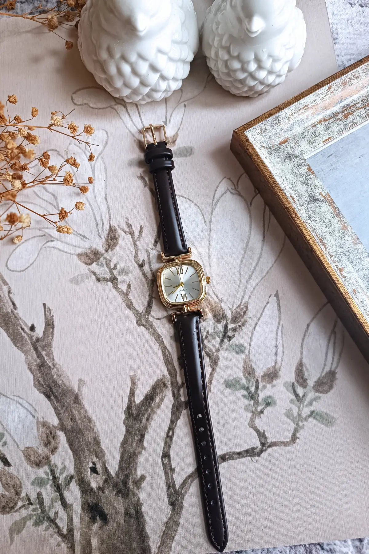 Elira Kahve Kordon Beyaz Kardan Kare Vintage Kadın Kol Saati
