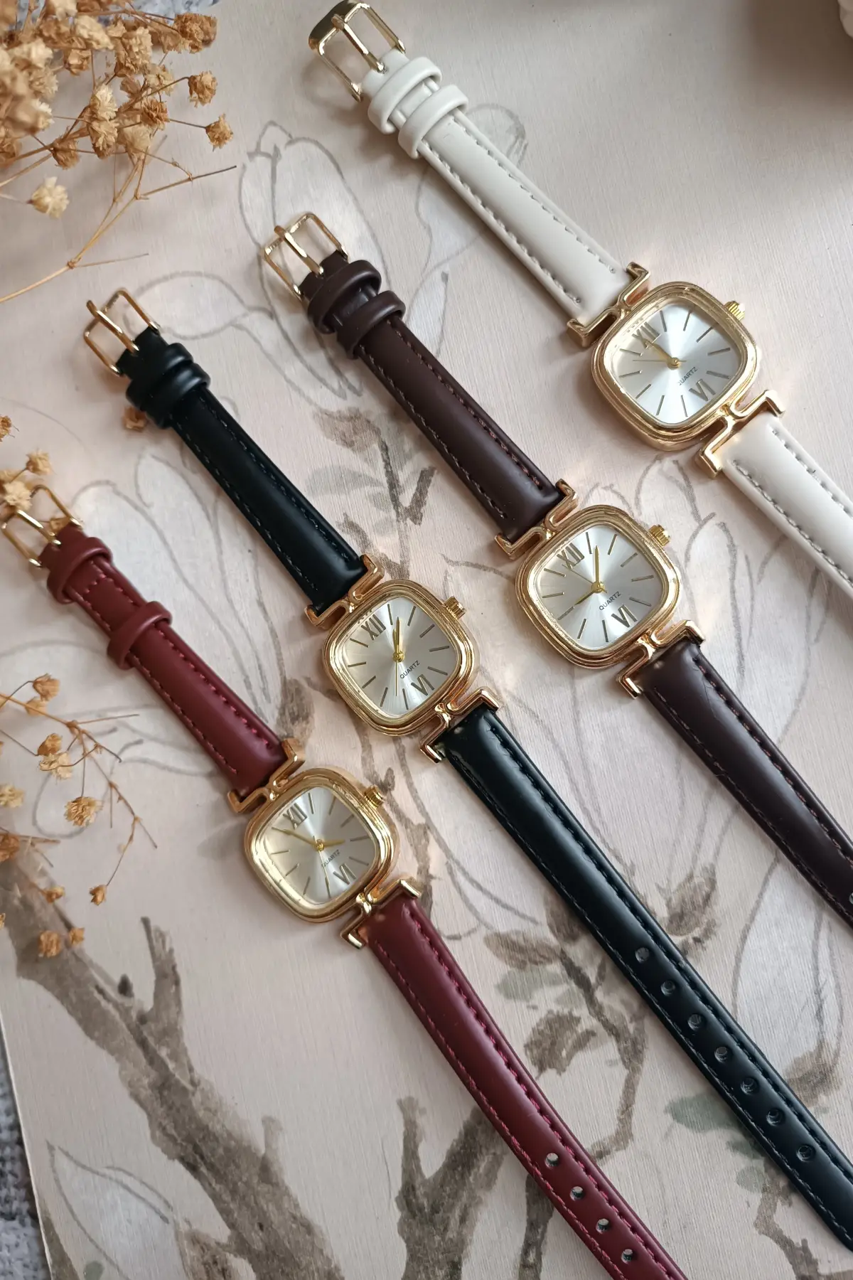 Elira Bordo Kordon Beyaz Kardan Kare Vintage Kadın Kol Saati