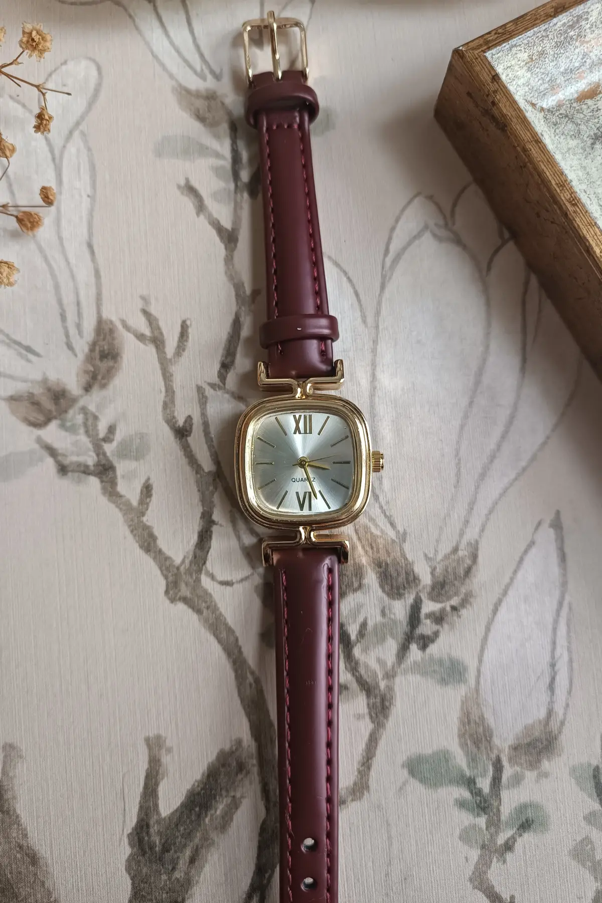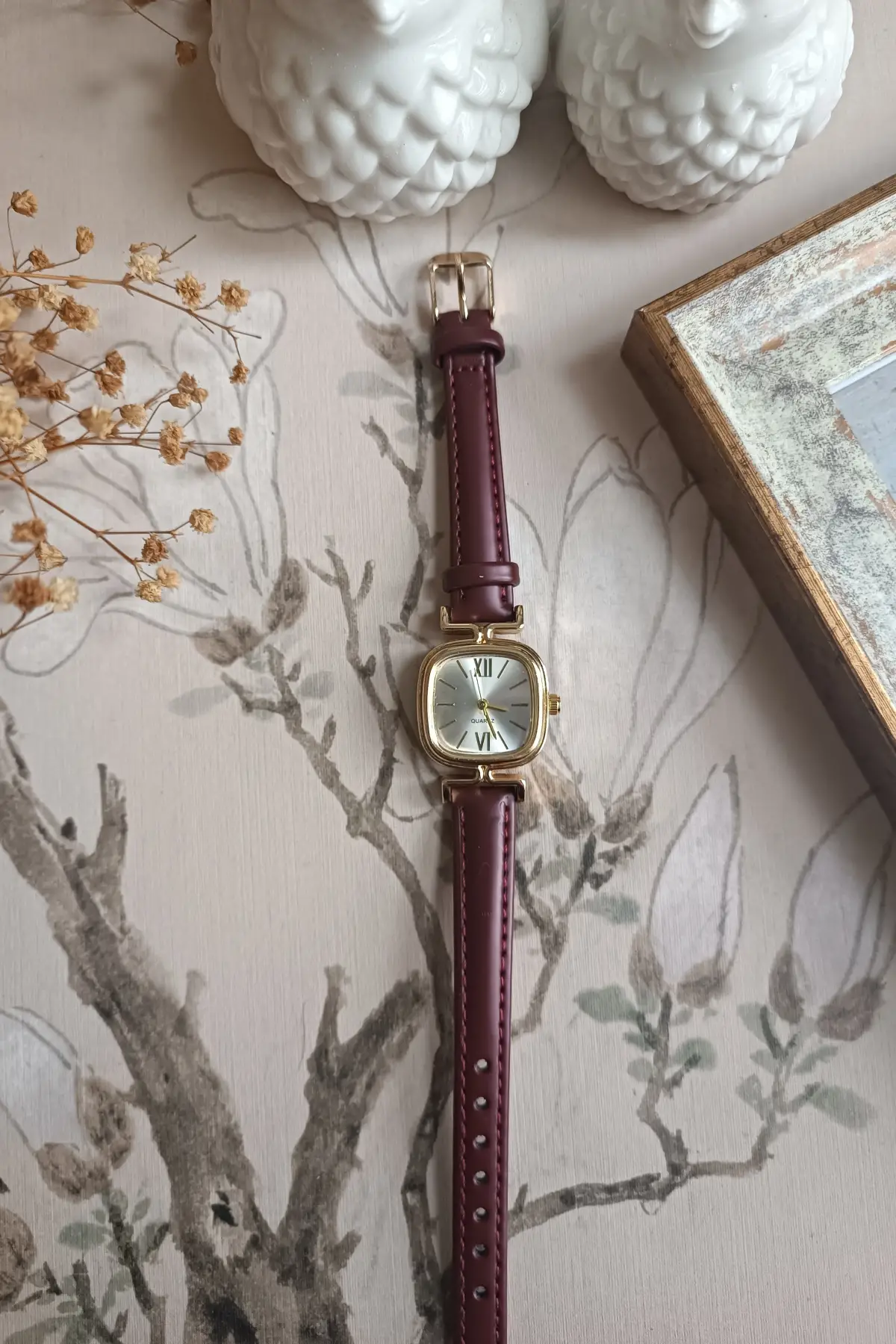 Elira Bordo Kordon Beyaz Kardan Kare Vintage Kadın Kol Saati