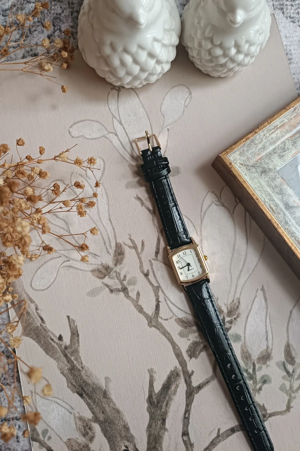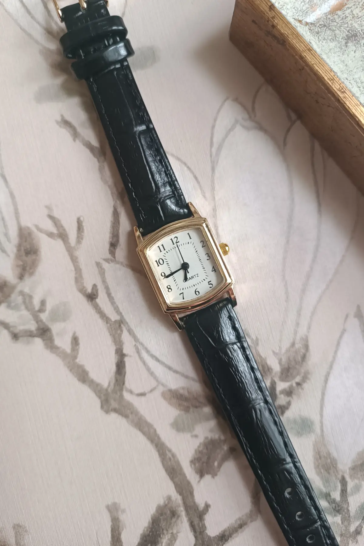 Elira Siyah Kordon Beyaz Kardan Kare Vintage Kadın Kol Saati