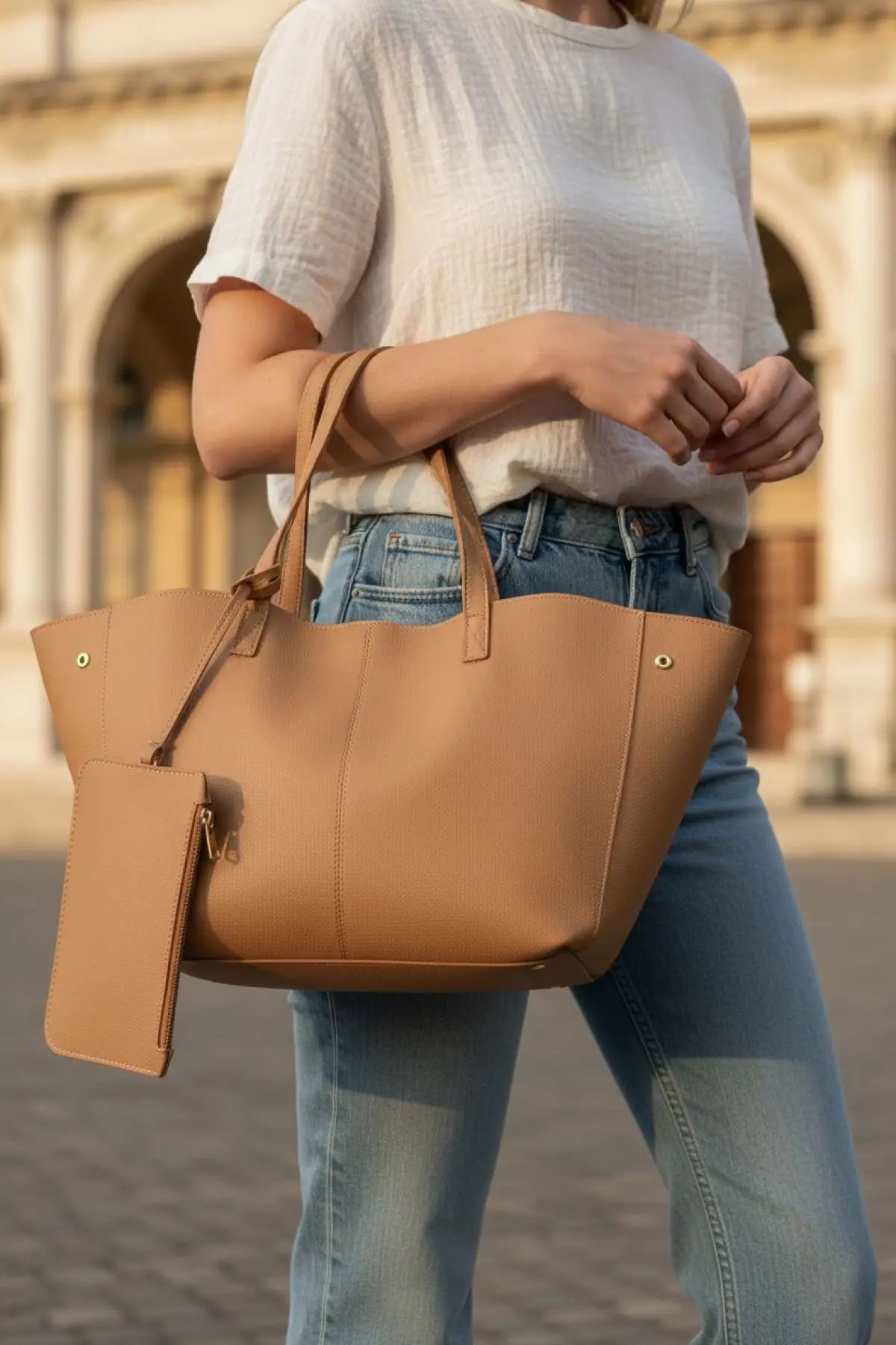 Robin Camel Rengi Cilt Big Shopper Cüzdanlı Kadın Omuz Çantası