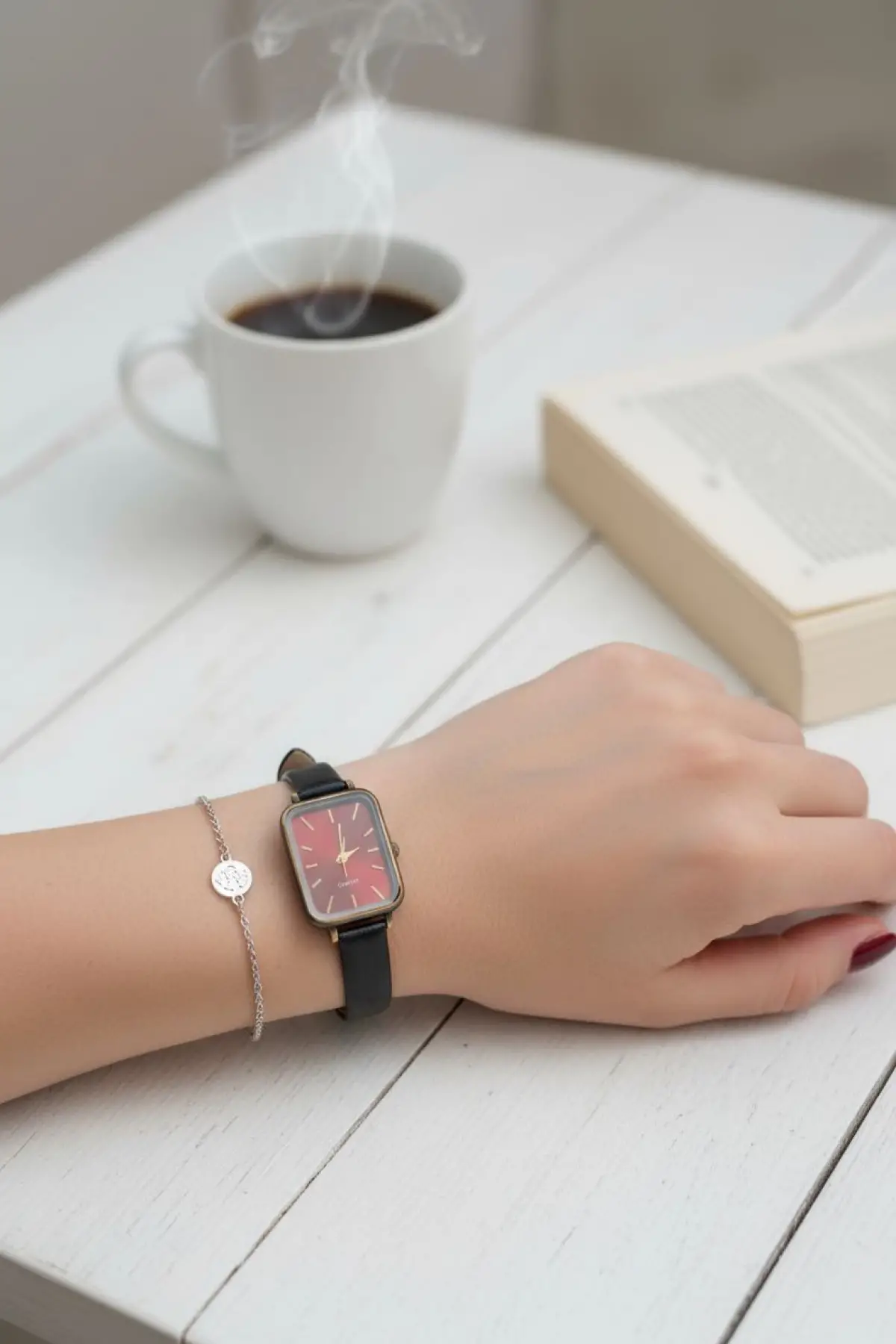 Nicole Siyah Cilt Bordo Deri Kordonlu Kare Minimal Kadın Kol Saati