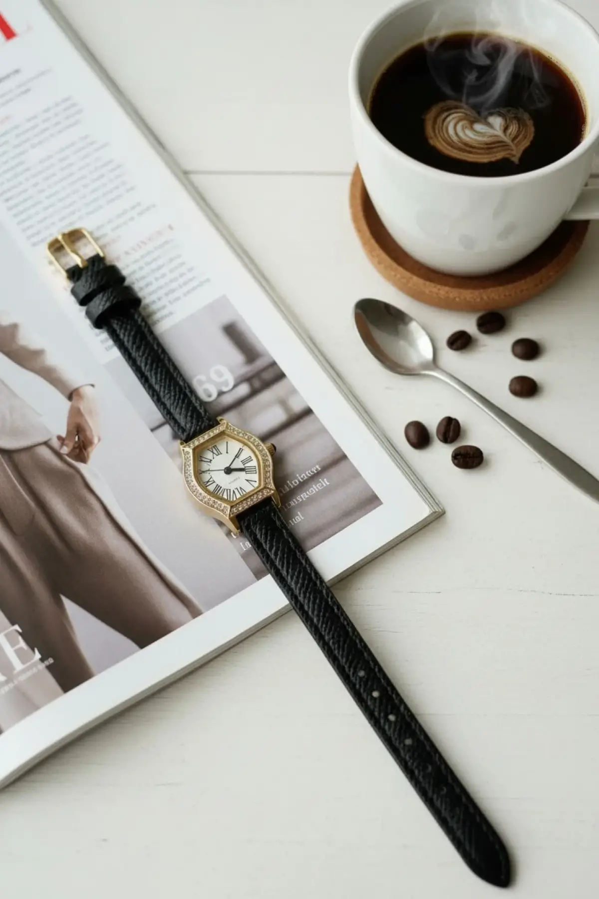 Juana Premium Su Geçirmez Siyah Deri Kordonlu Gold Taşlı Kasa Romen Rakamlı Vintage Kadın Kol Saati