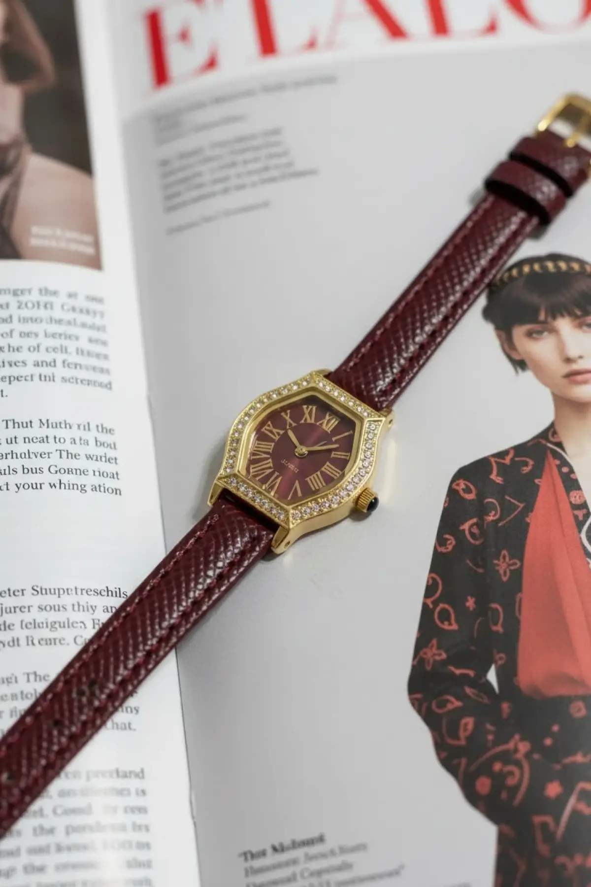 Juana Premium Su Geçirmez Bordo Deri Kordonlu Gold Taşlı Kasa Romen Rakamlı Vintage Kadın Kol Saati