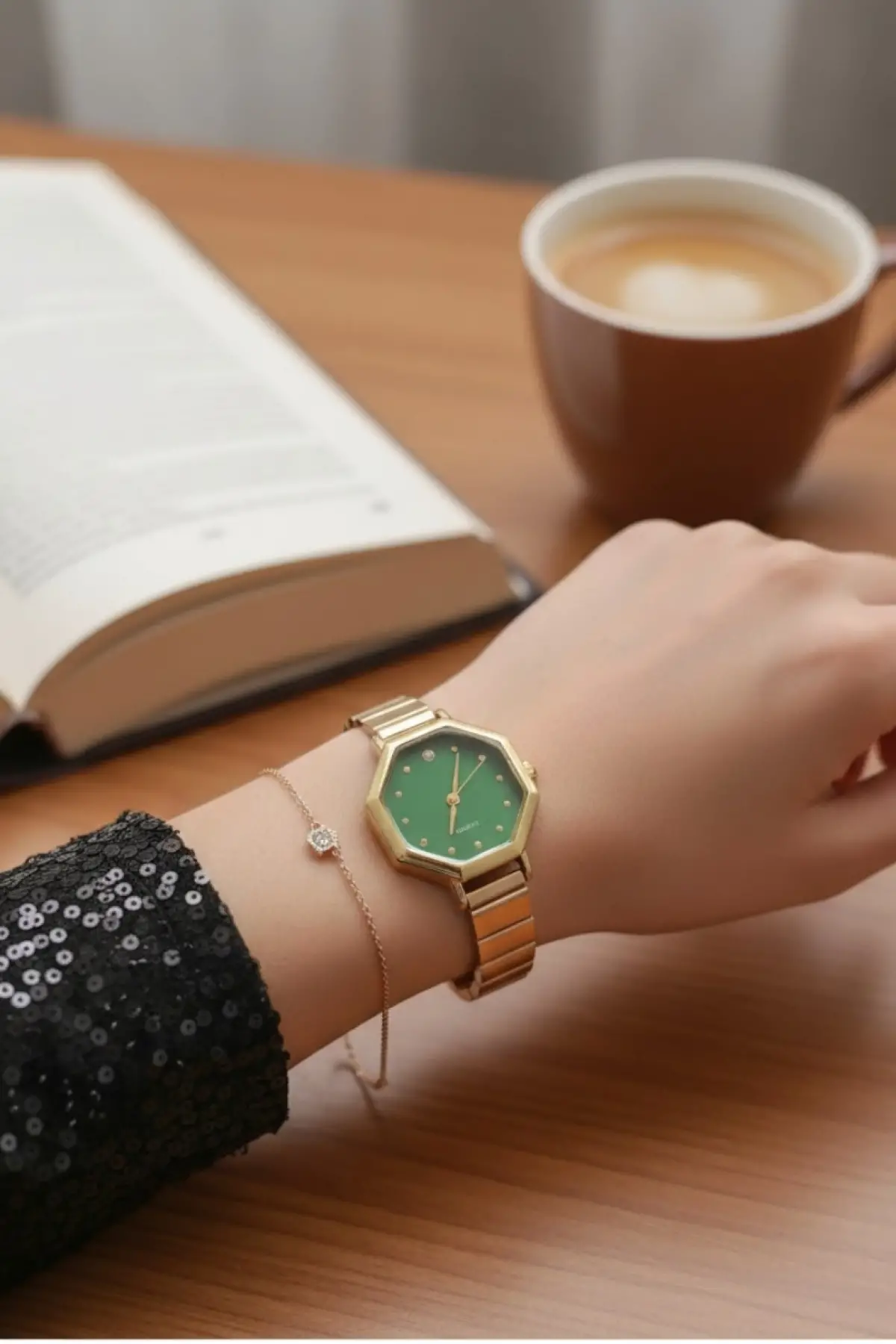 Kaliforniya Gold Rengi Yeşil Kadranlı Sekizgen Taş Detaylı Retro Kadın Kol Saati