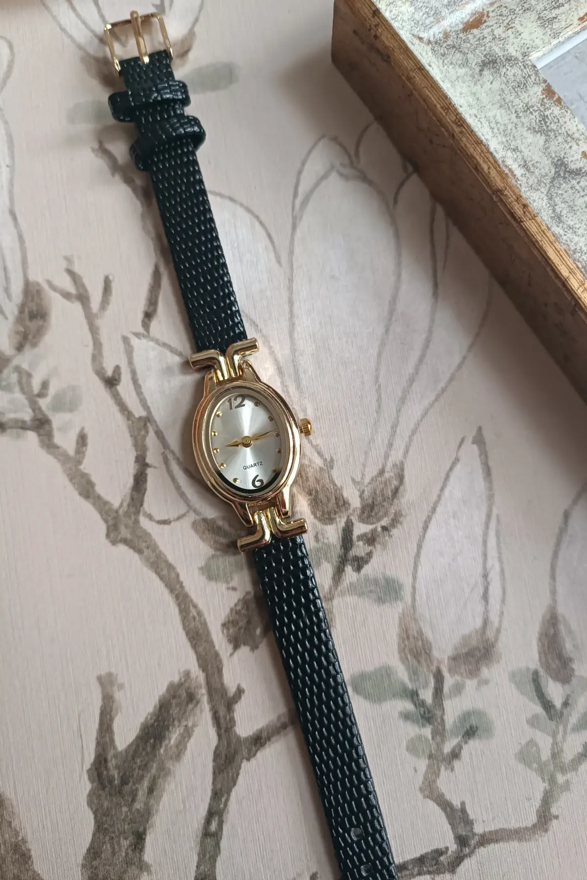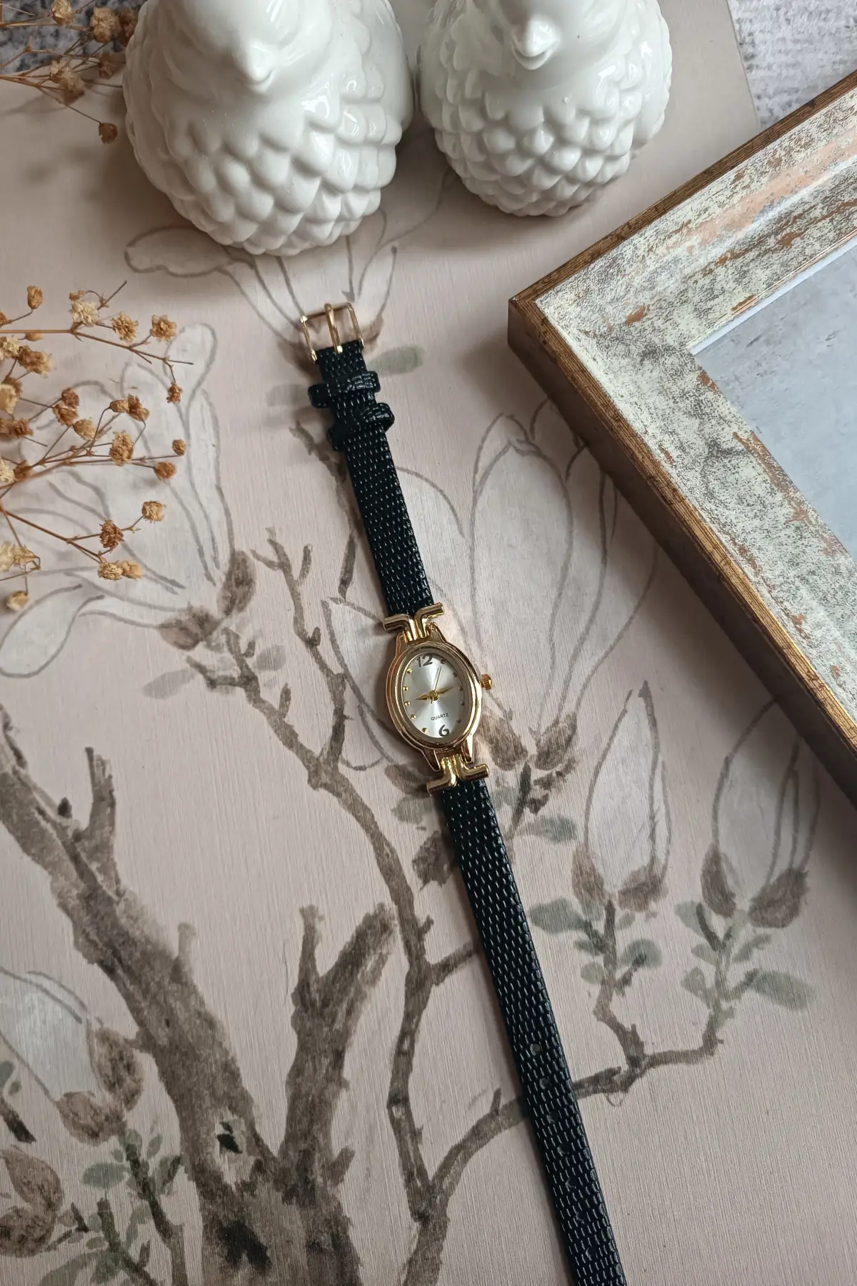 Kaira Siyah Desenli Deri Beyaz Kardan Oval Minimal Kadın Kol Saati
