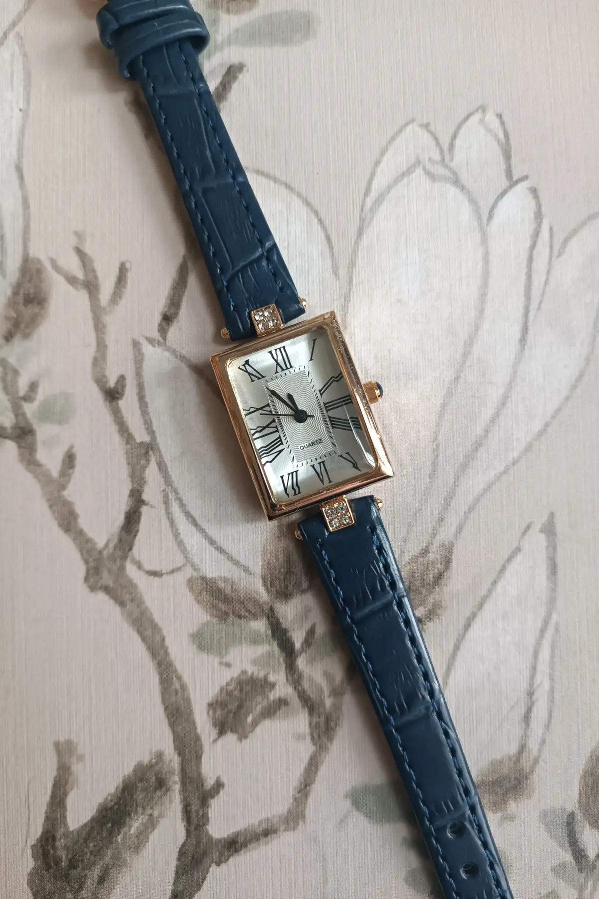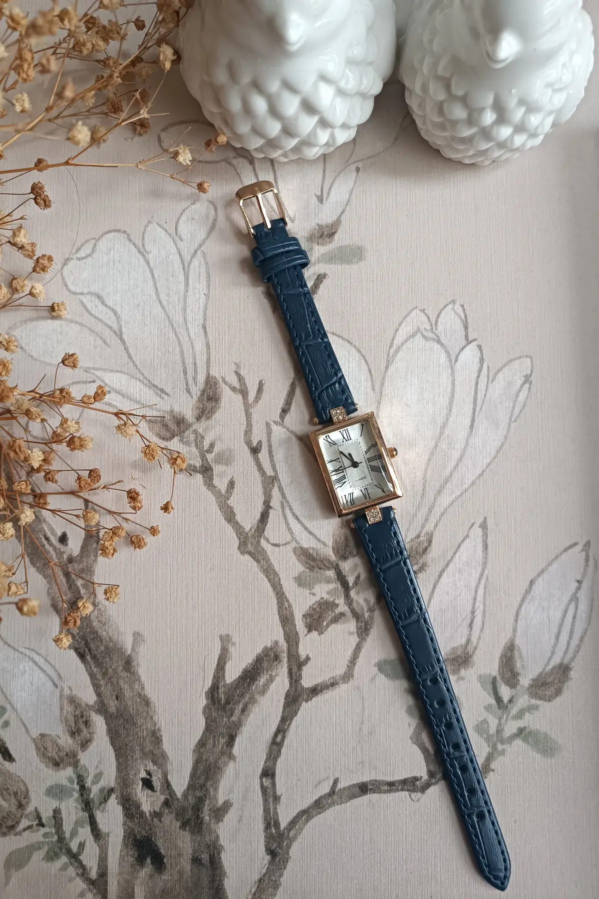 Lavinya Premium Su Geçirmez Lacivert Kroko Deri Kordonlu Gold Taşlı Kasa Beyaz Kadran Romen Rakamlı Vintage Kadın Kol Saati