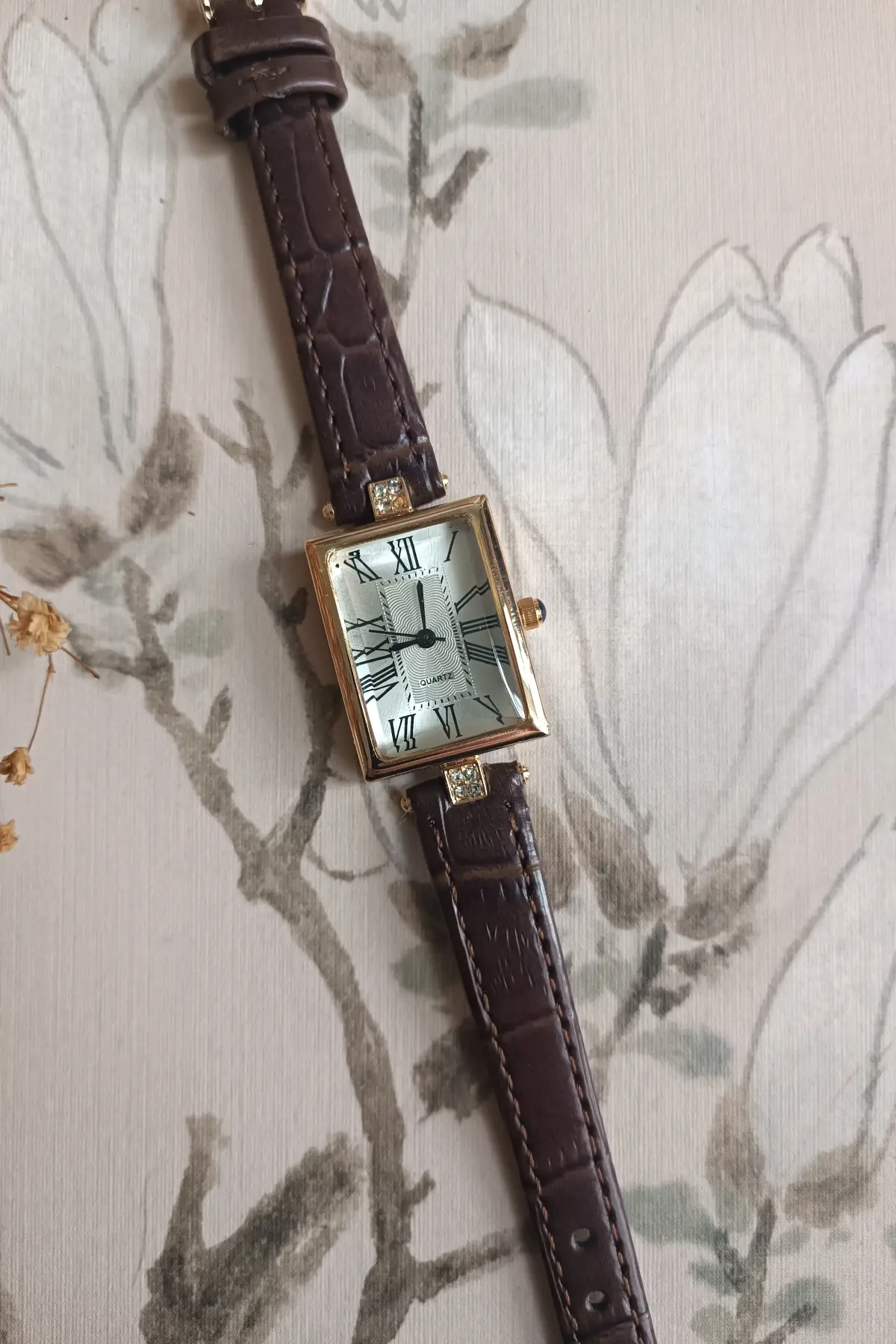 Juana Premium Su Geçirmez Taba Deri Kordonlu Gold Taşlı Kasa Romen Rakamlı Vintage Kadın Kol Saati