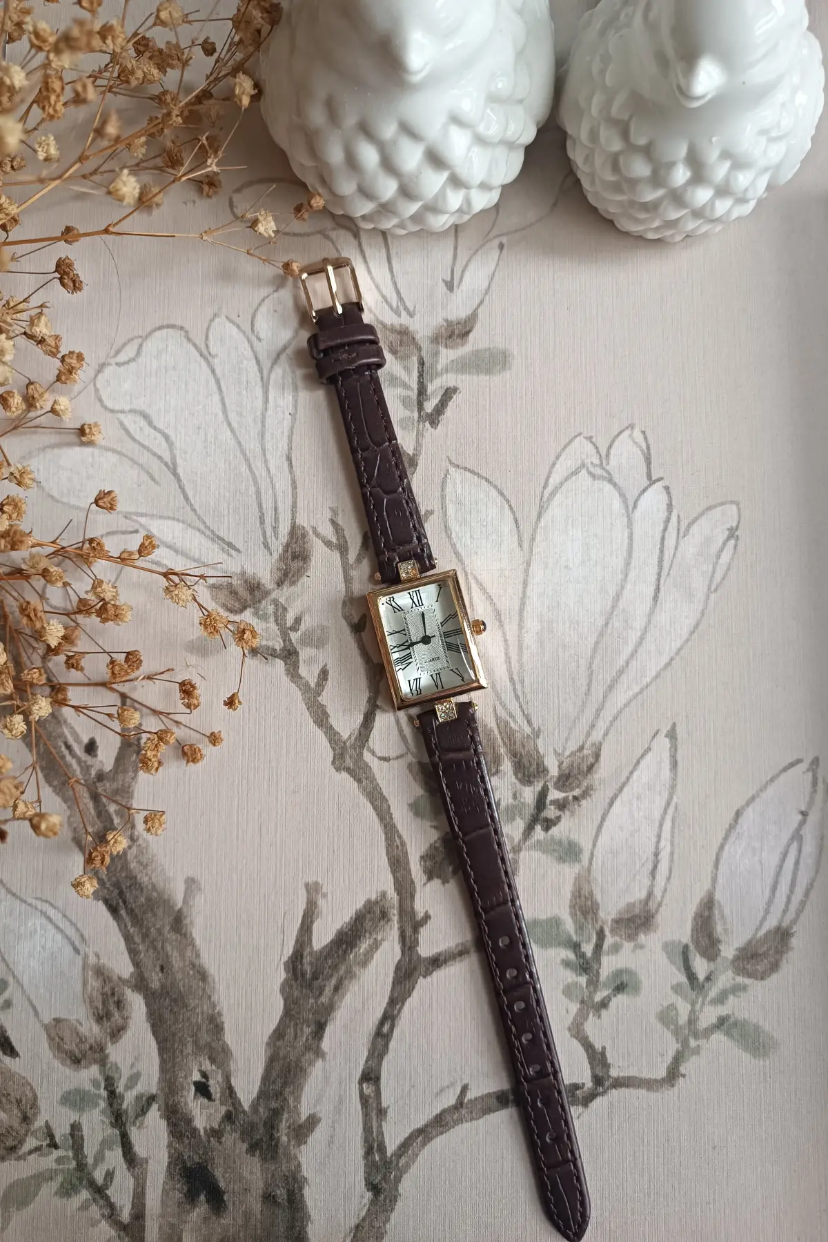 Lavinya Premium Su Geçirmez Kahve Kroko Deri Kordonlu Gold Taşlı Kasa Beyaz Kadran Romen Rakamlı Vintage Kadın Kol Saati