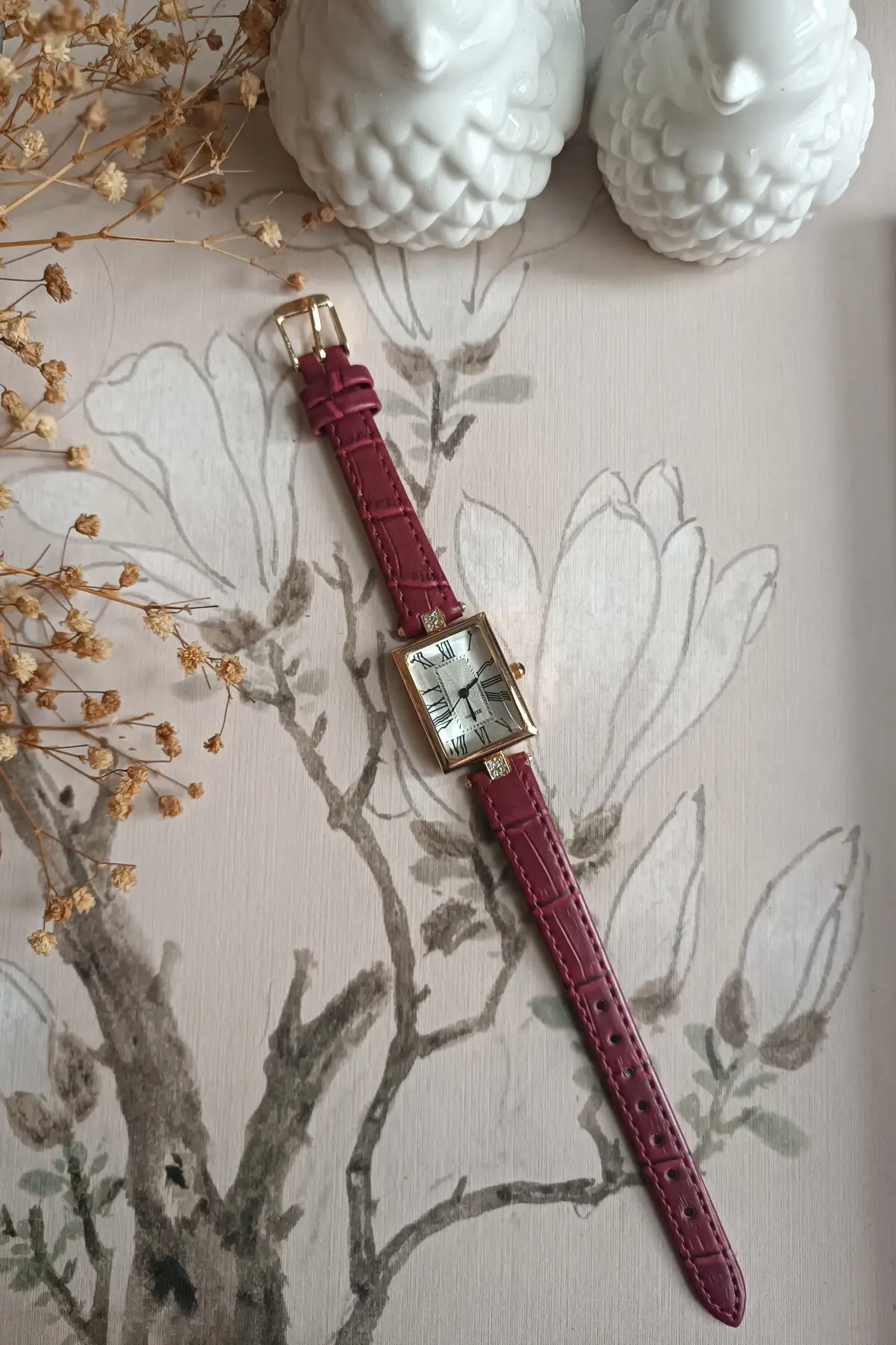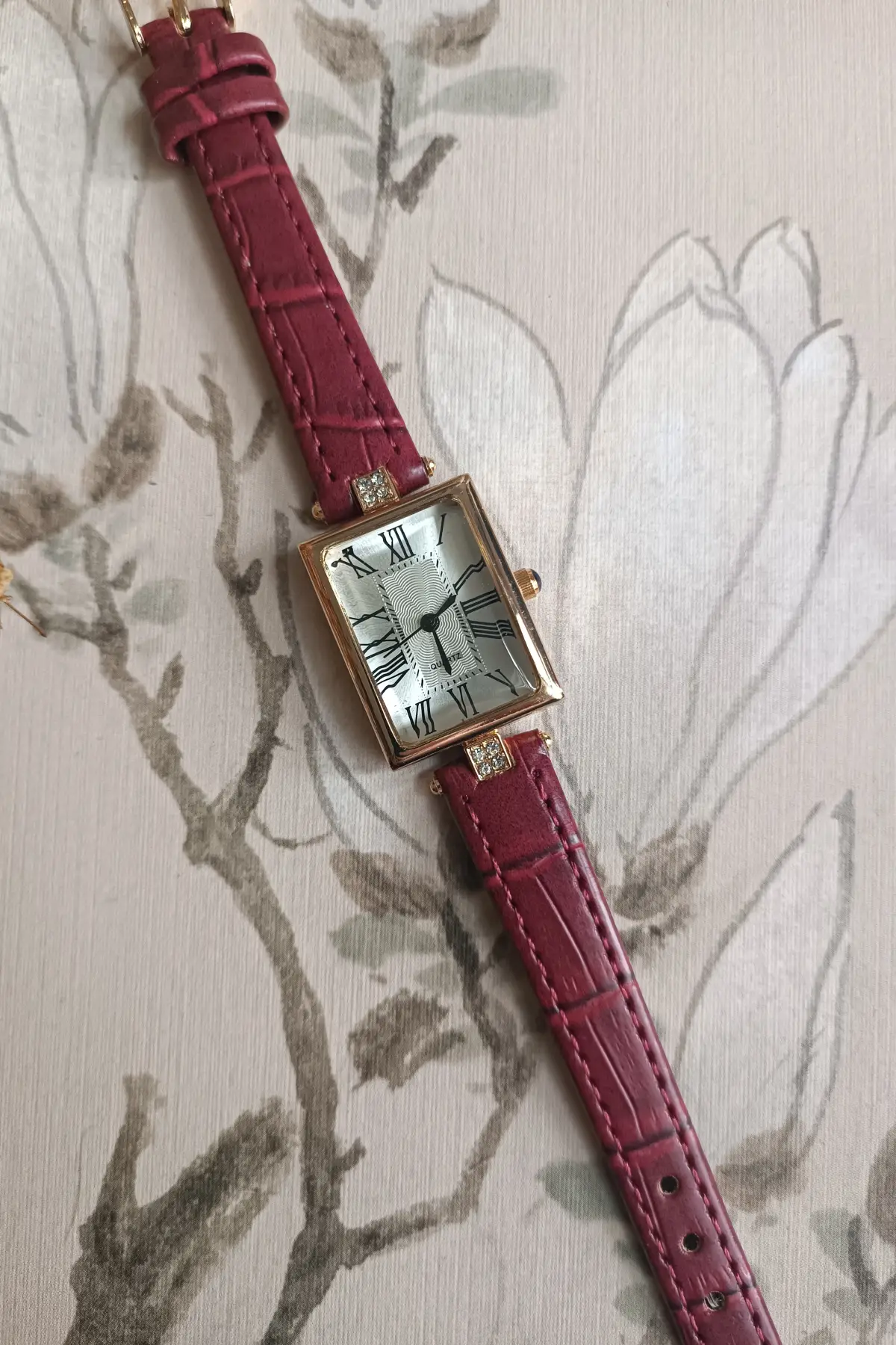 Juana Premium Su Geçirmez Bordo Deri Kordonlu Gold Taşlı Kasa Romen Rakamlı Vintage Kadın Kol Saati