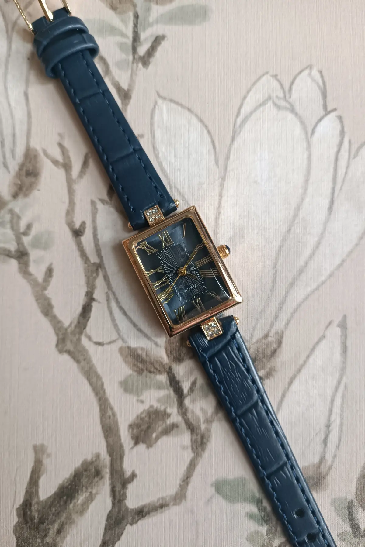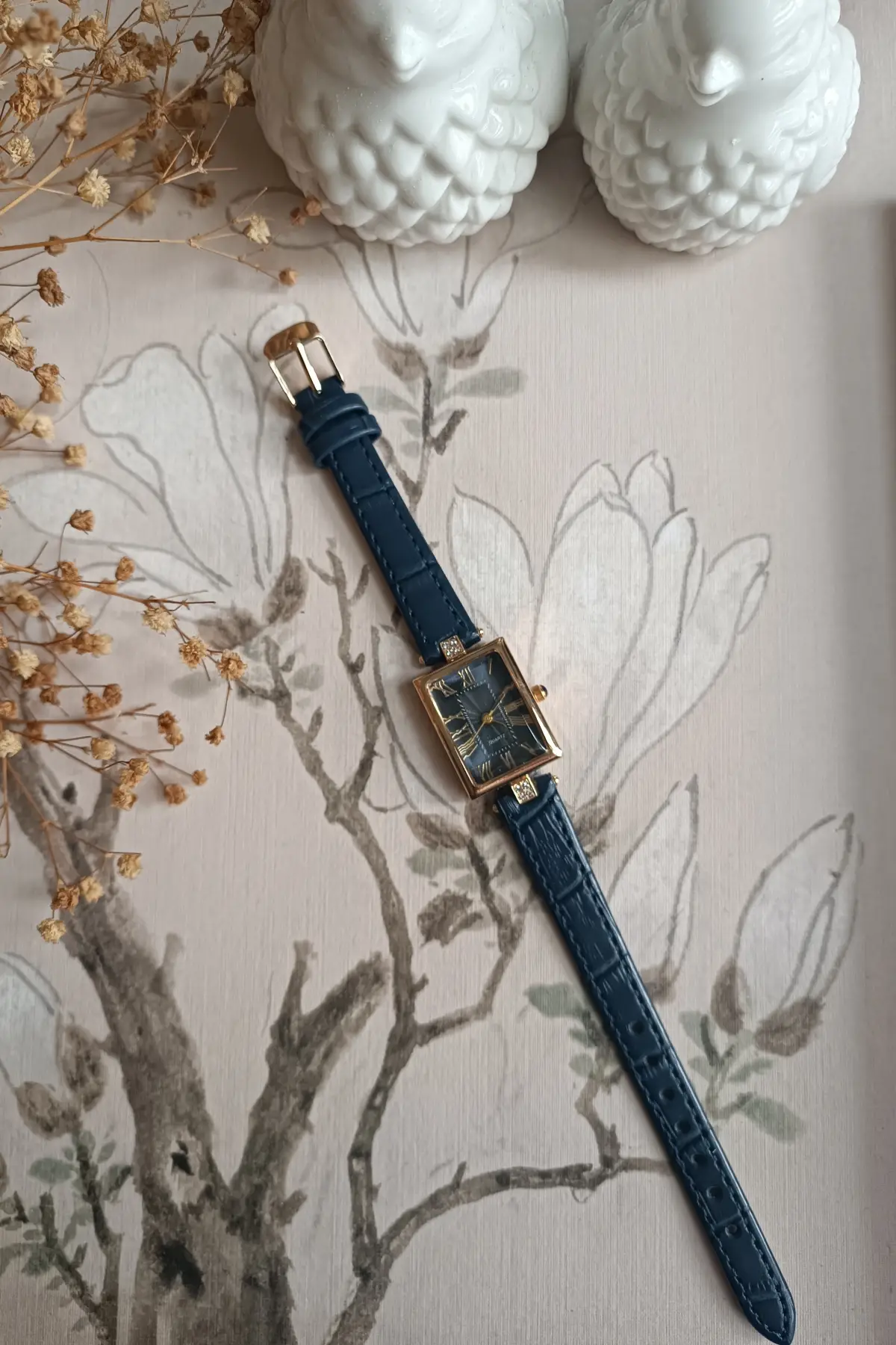 Lavinya Premium Su Geçirmez Lacivert Kroko Deri Kordonlu Gold Taşlı Kasa Lacivert Kadran Romen Rakamlı Vintage Kadın Kol Saati