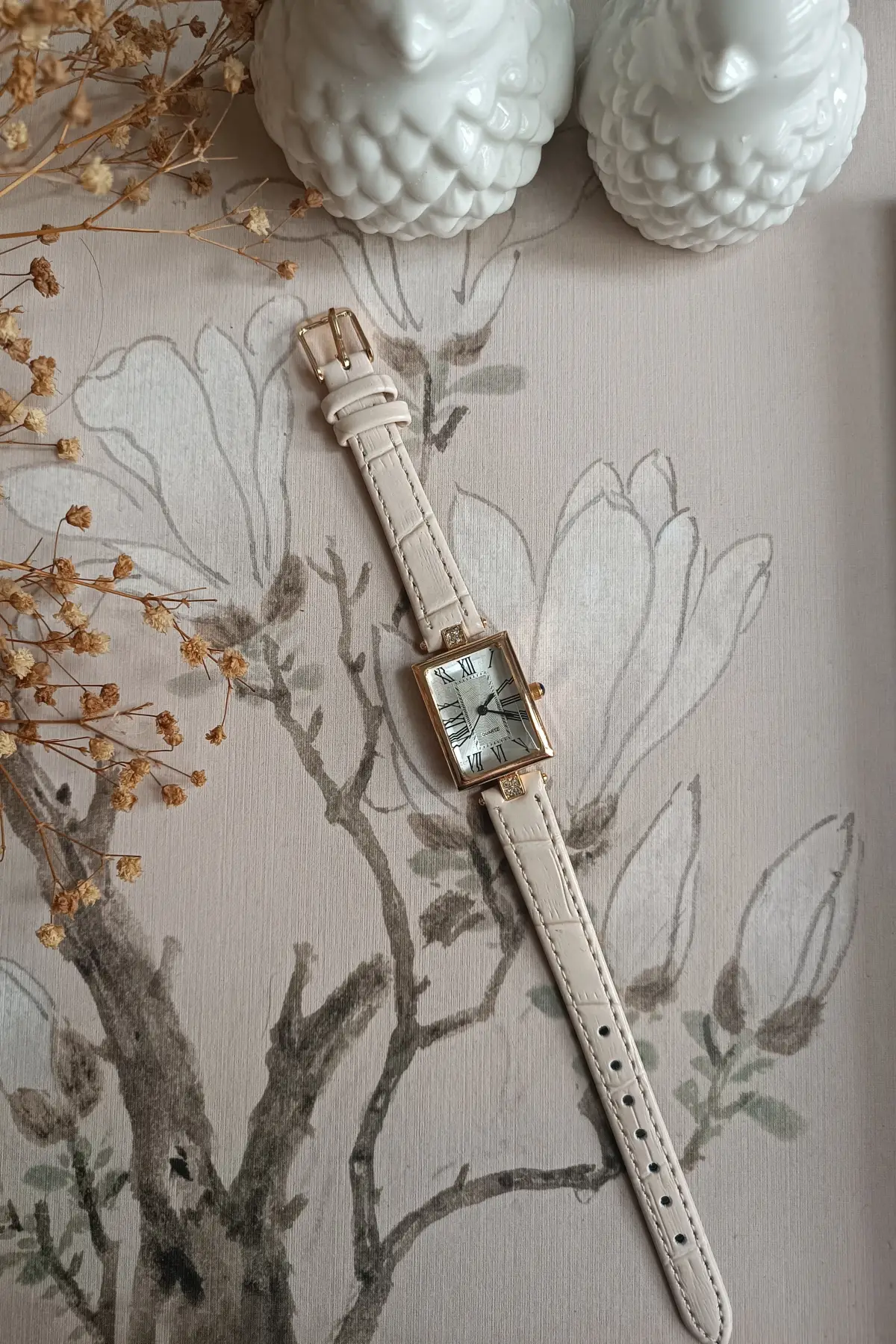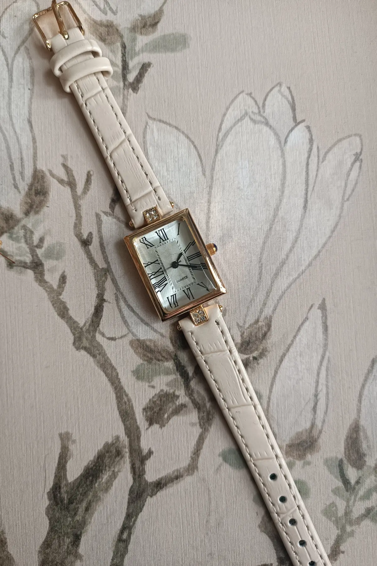 Lavinya Premium Su Geçirmez Krem Kroko Deri Kordonlu Gold Taşlı Kasa Beyaz Kadran Romen Rakamlı Vintage Kadın Kol Saati