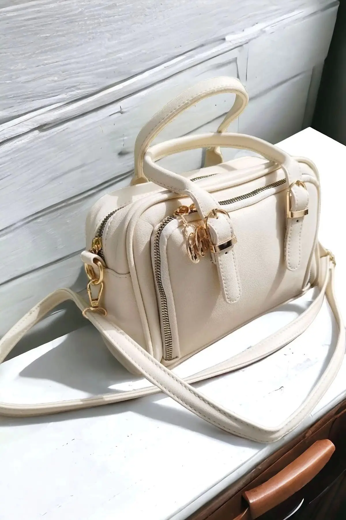 Lovina Krem Çift Fermuar Gözlü Trend Kadın Omuz Çantası