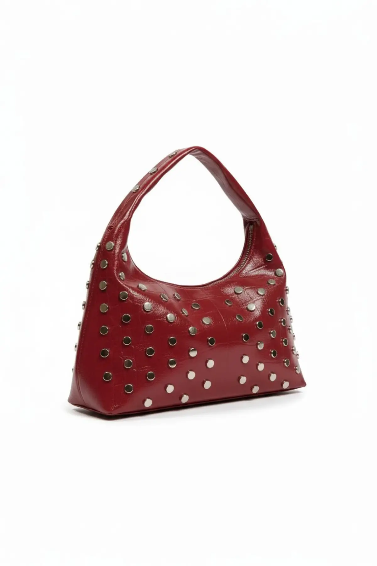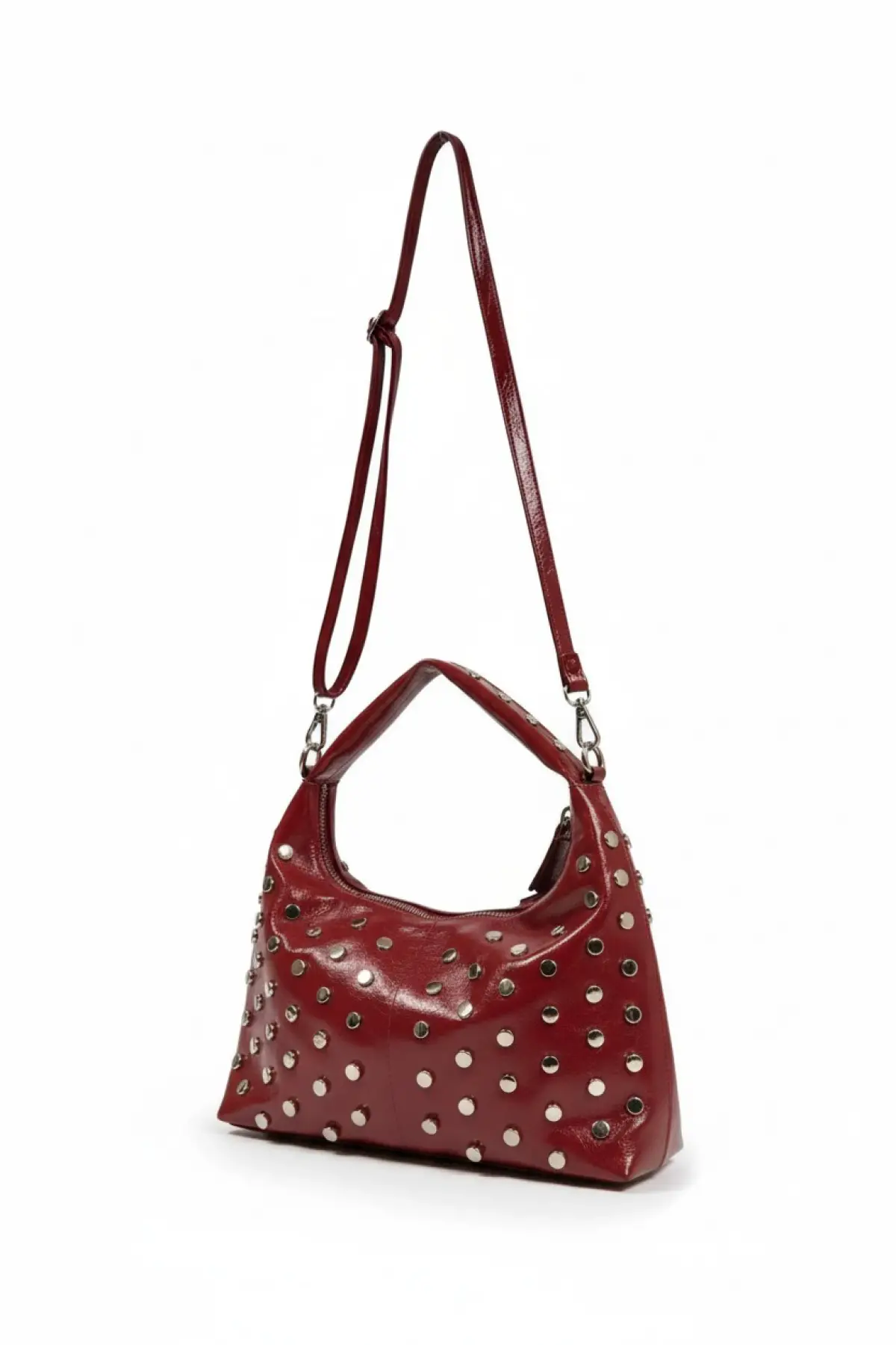 Lunera Bordo Vegan Deri Zımba Detaylı Çift Fermuar Kapamalı Kadın El Ve Omuz Çantası