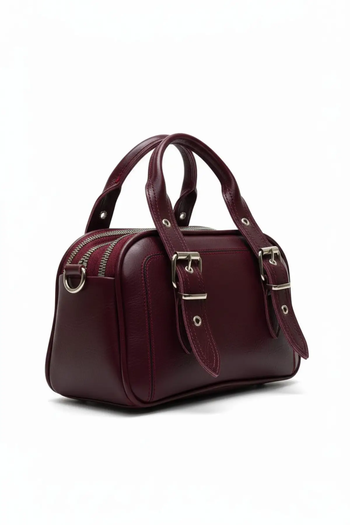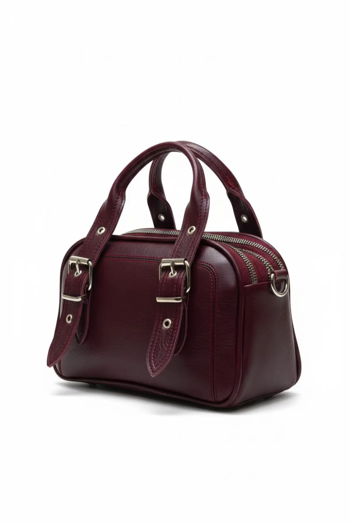 Melina Bordo Vegan deri üç bölmeli fermuar kapamalı Kadın el kol ve omuz çantası