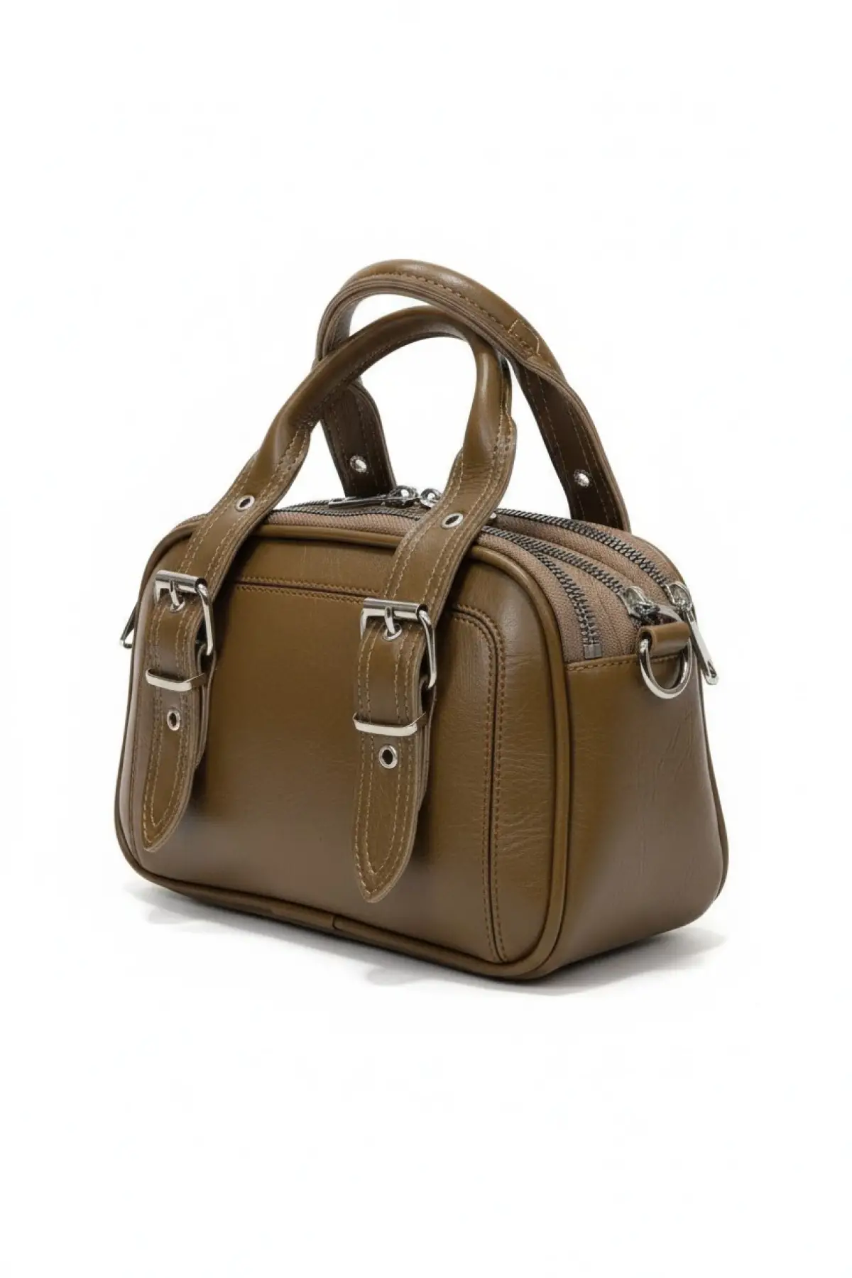 Melina Kahverengi Vegan deri üç bölmeli fermuar kapamalı Kadın el kol ve omuz çantası