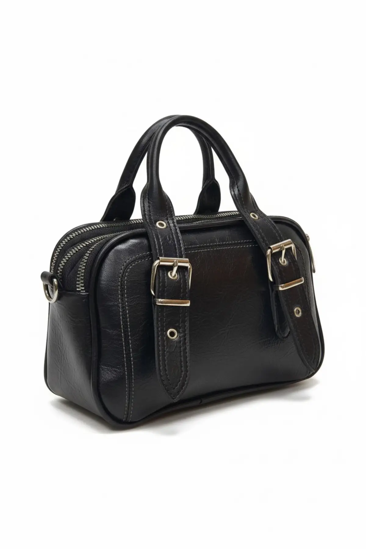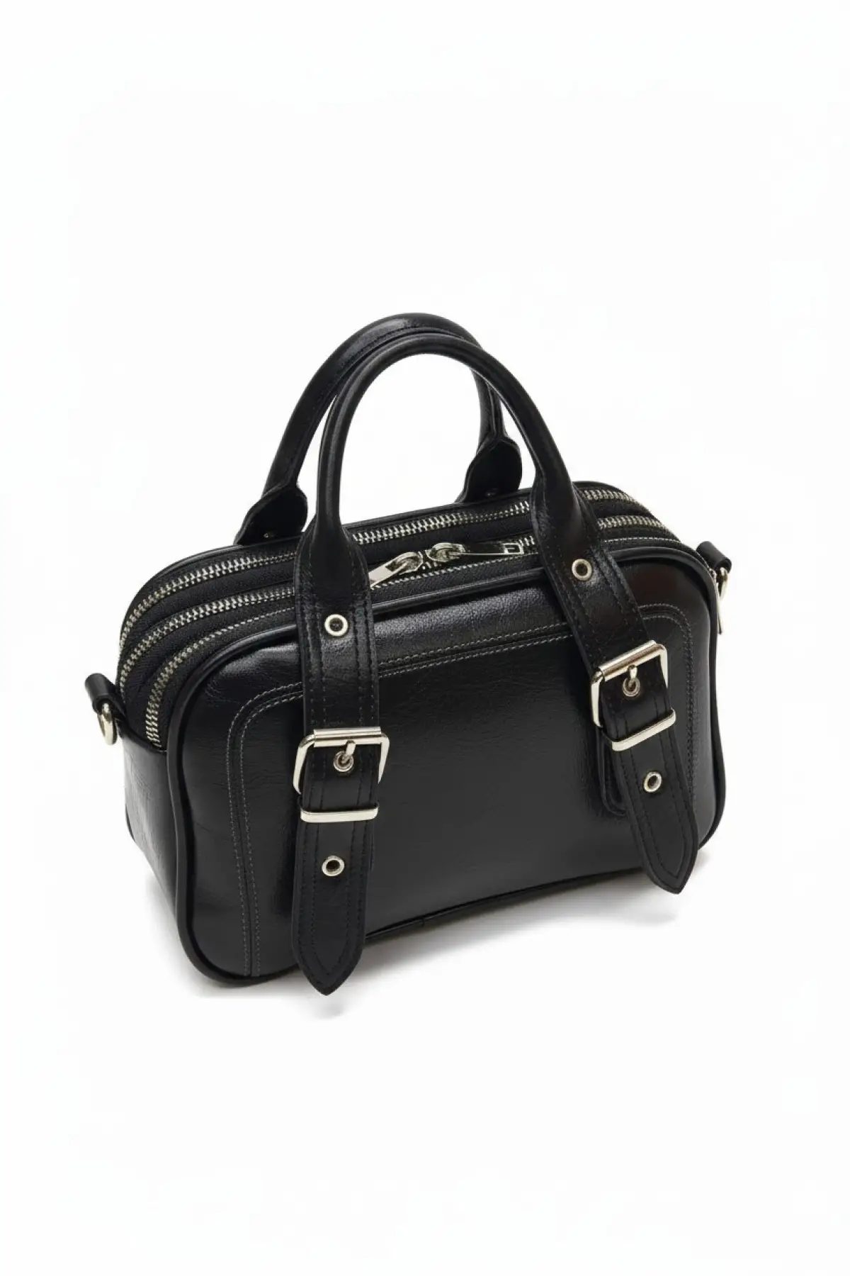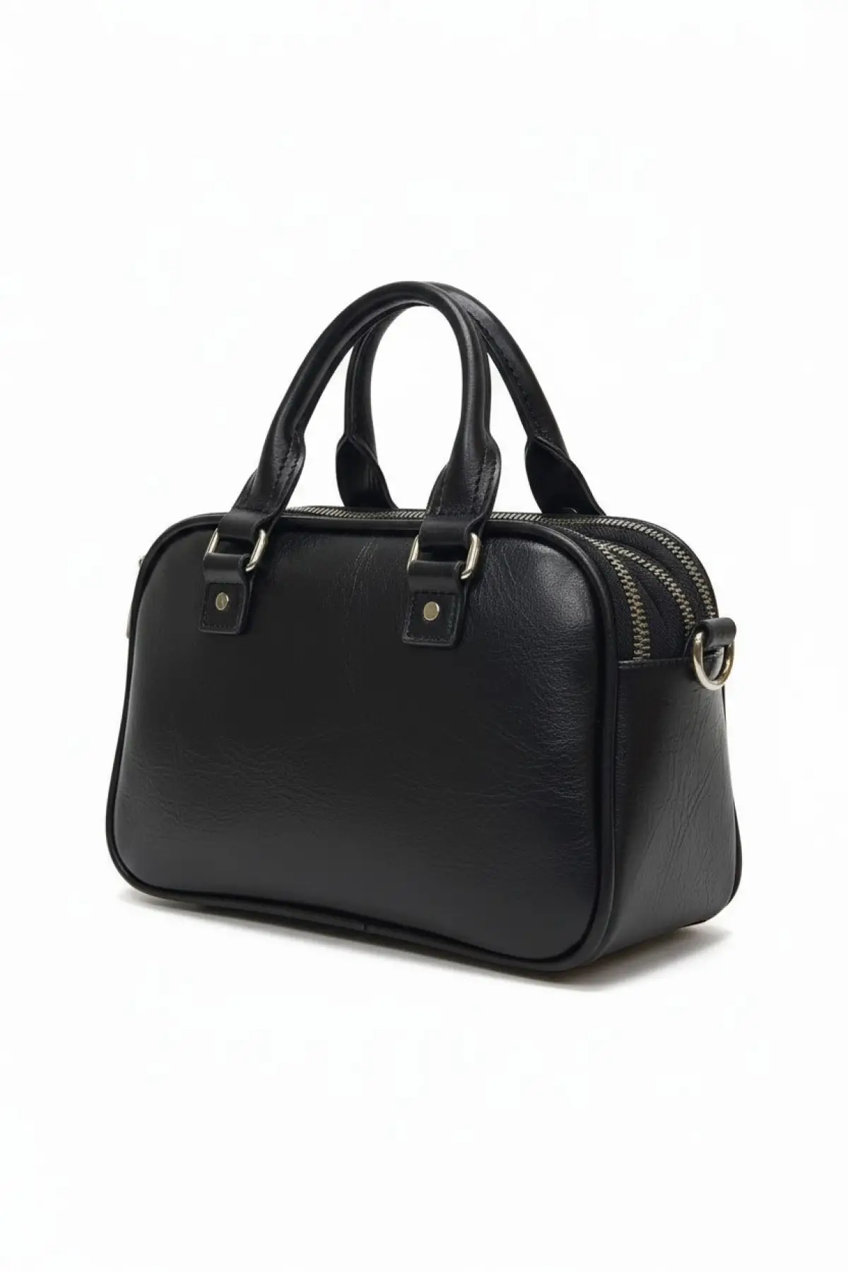 Melina Siyah Vegan deri üç bölmeli fermuar kapamalı Kadın el kol ve omuz çantası