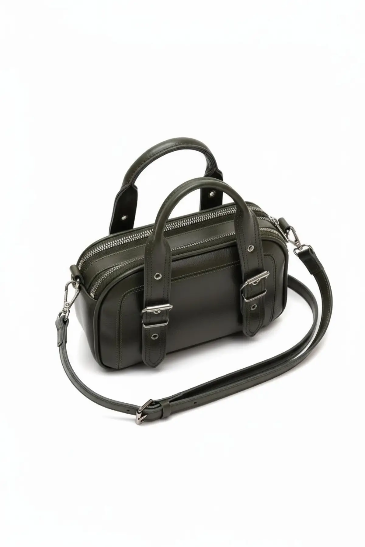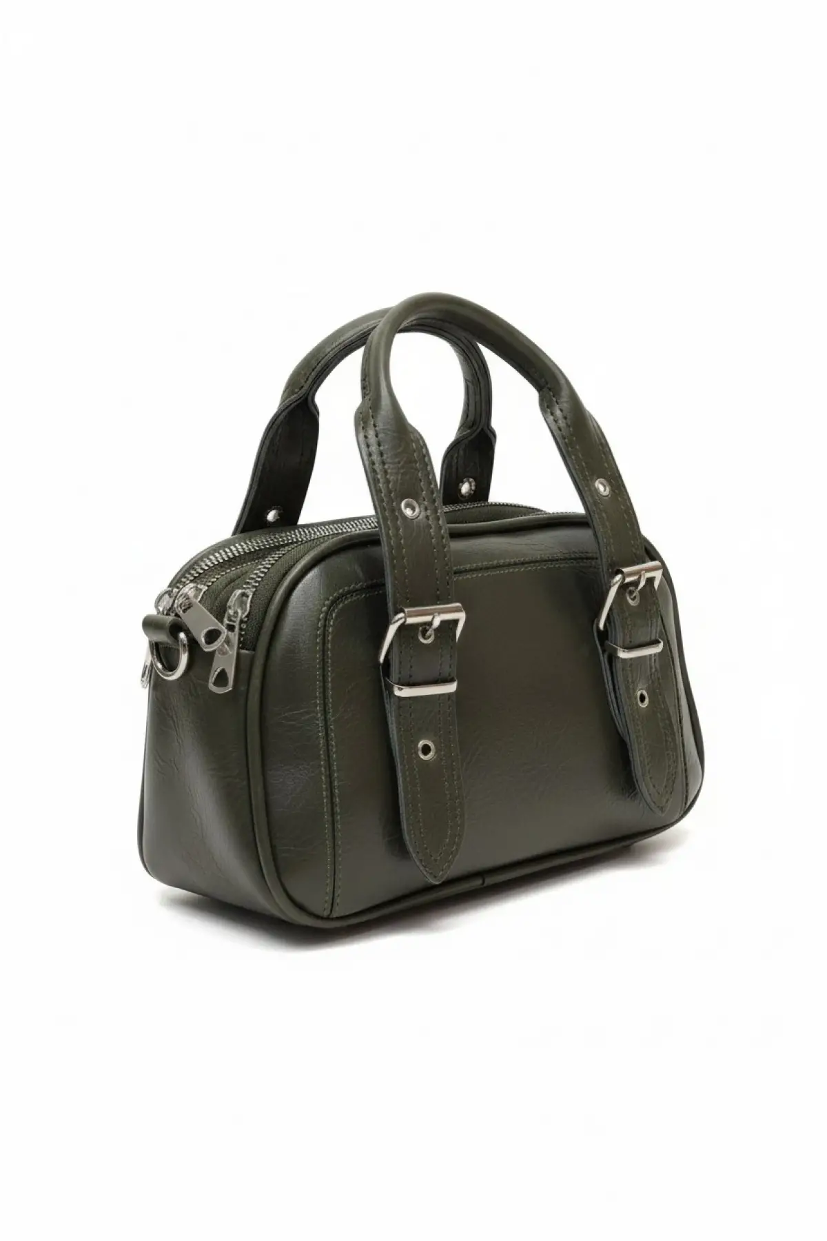 Melina Haki Vegan deri üç bölmeli fermuar kapamalı Kadın el kol ve omuz çantası