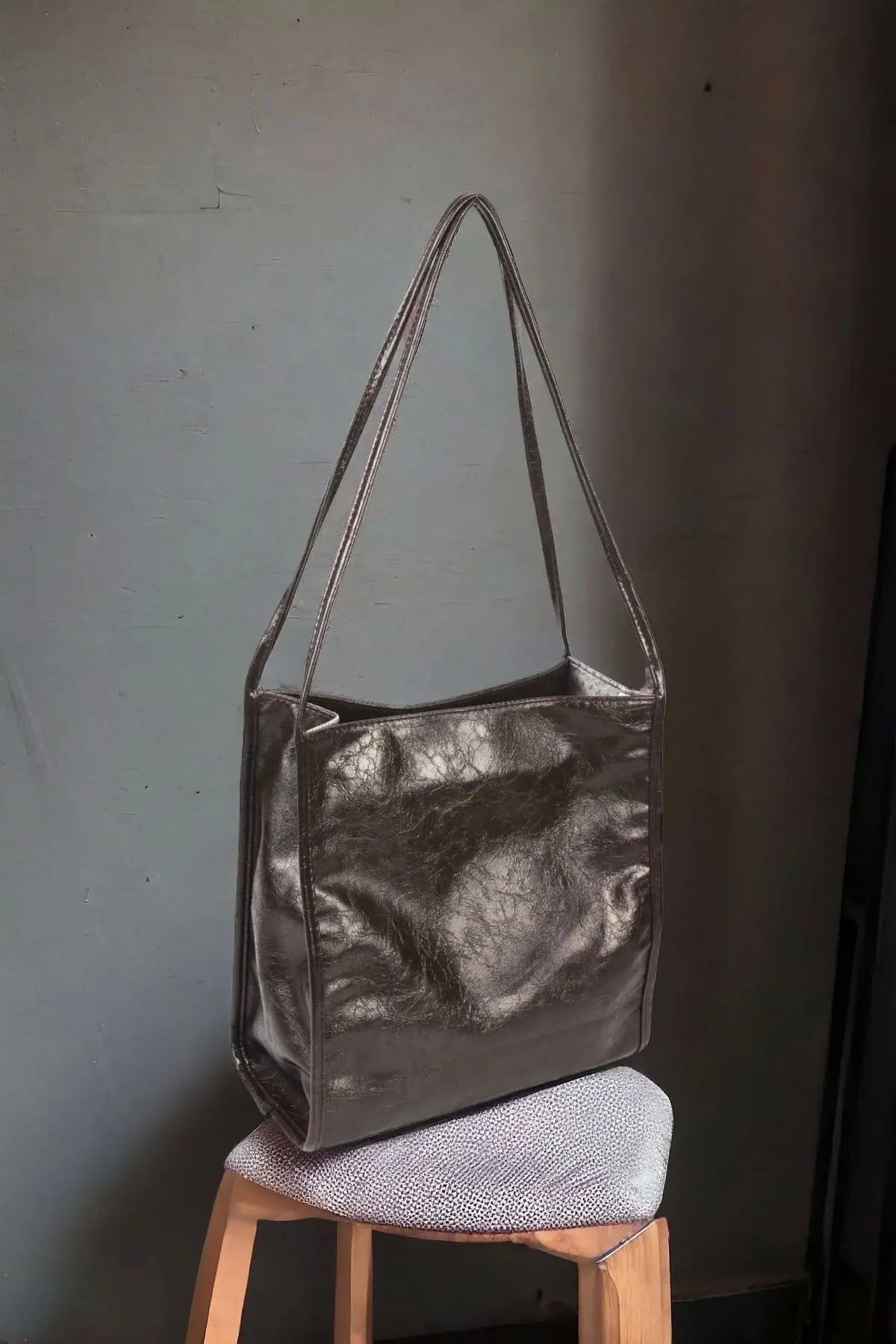 Milano İnce Askılı Rugan Eskitme Suni Deri Salaş Kadın Kol Çantası Metalik Gri
