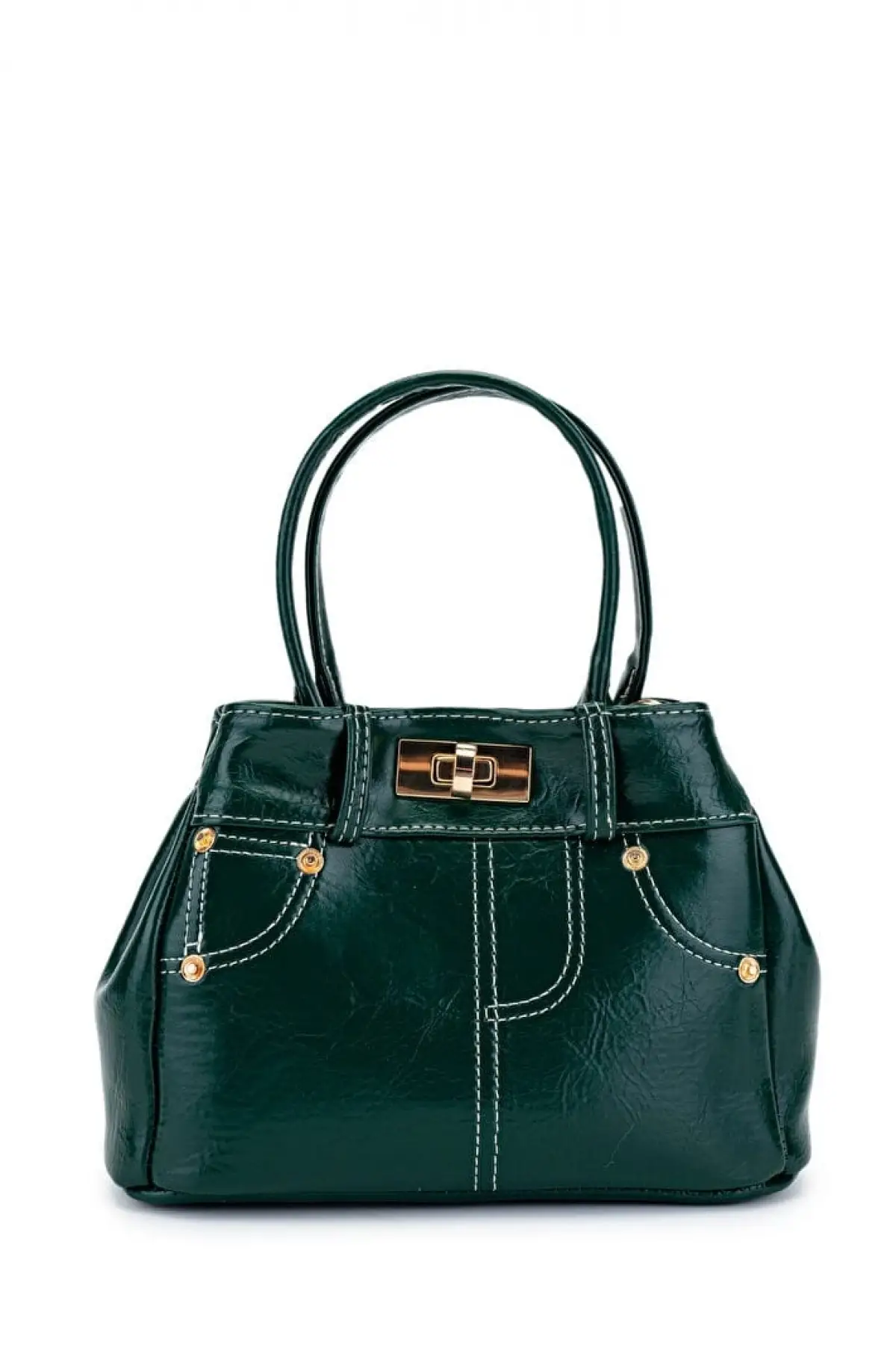 Melina Yağ Yeşili Vegan deri üç bölmeli fermuar kapamalı Kadın el kol ve omuz çantası