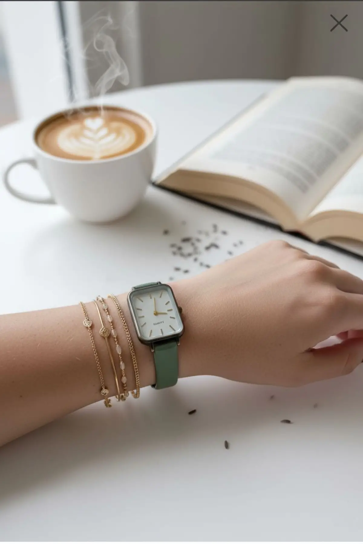 Caroline Krem Cilt Yeşil Retro Deri Kordonlu Kare Minimal Kadın Kol Saati