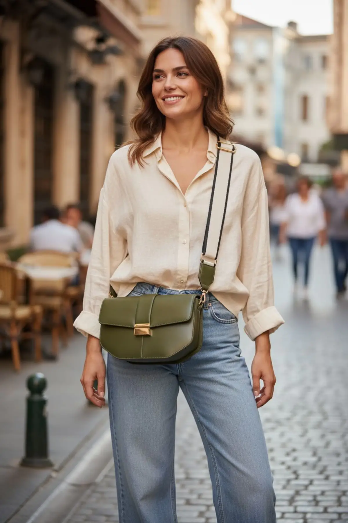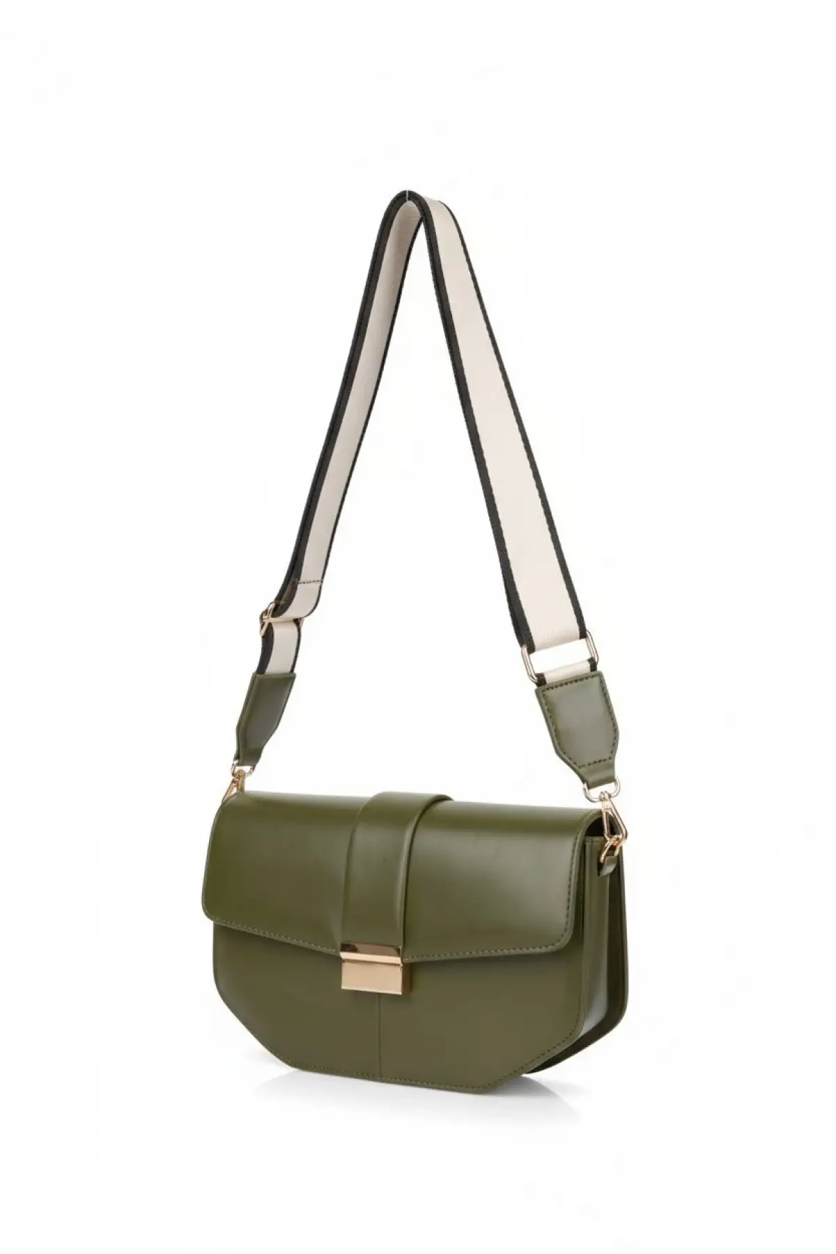 Roma Kanvas Şerit Askılı Gold Tokalı Haki Cilt Trend Kadın Omuz Çantası