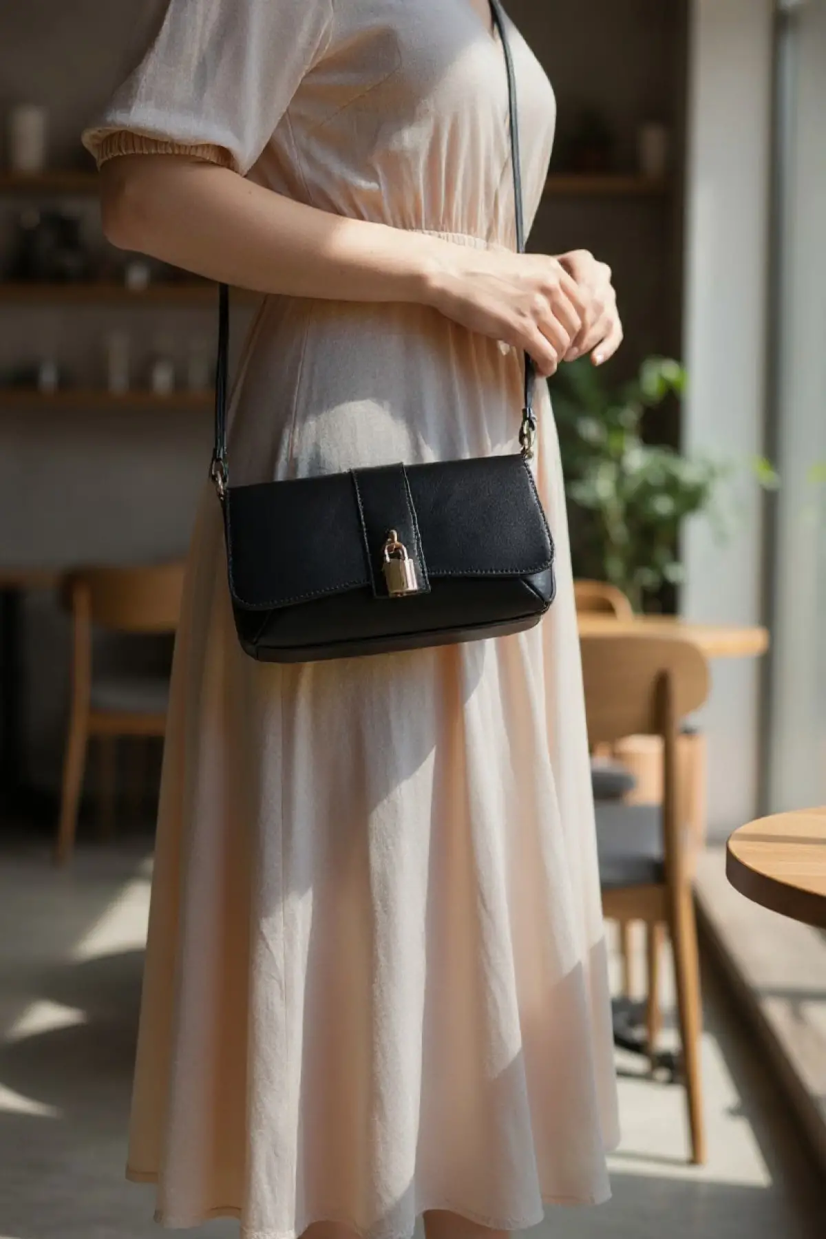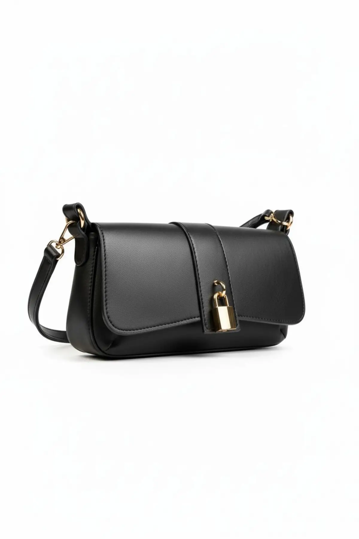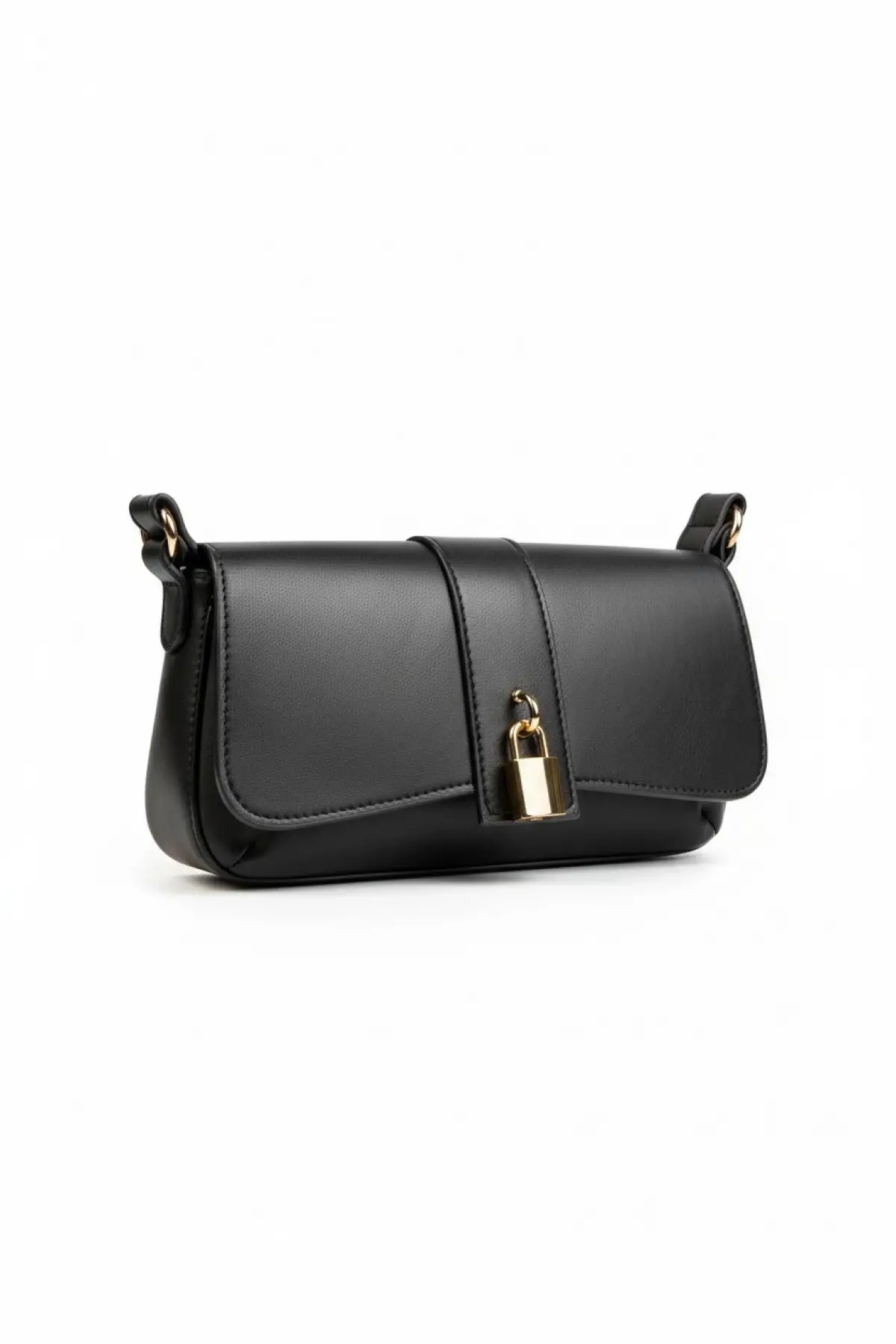 Sahra Önden Kilit Aksesuarlı Asimetrik Siyah Cilt Trend Kadın Omuz Çantası