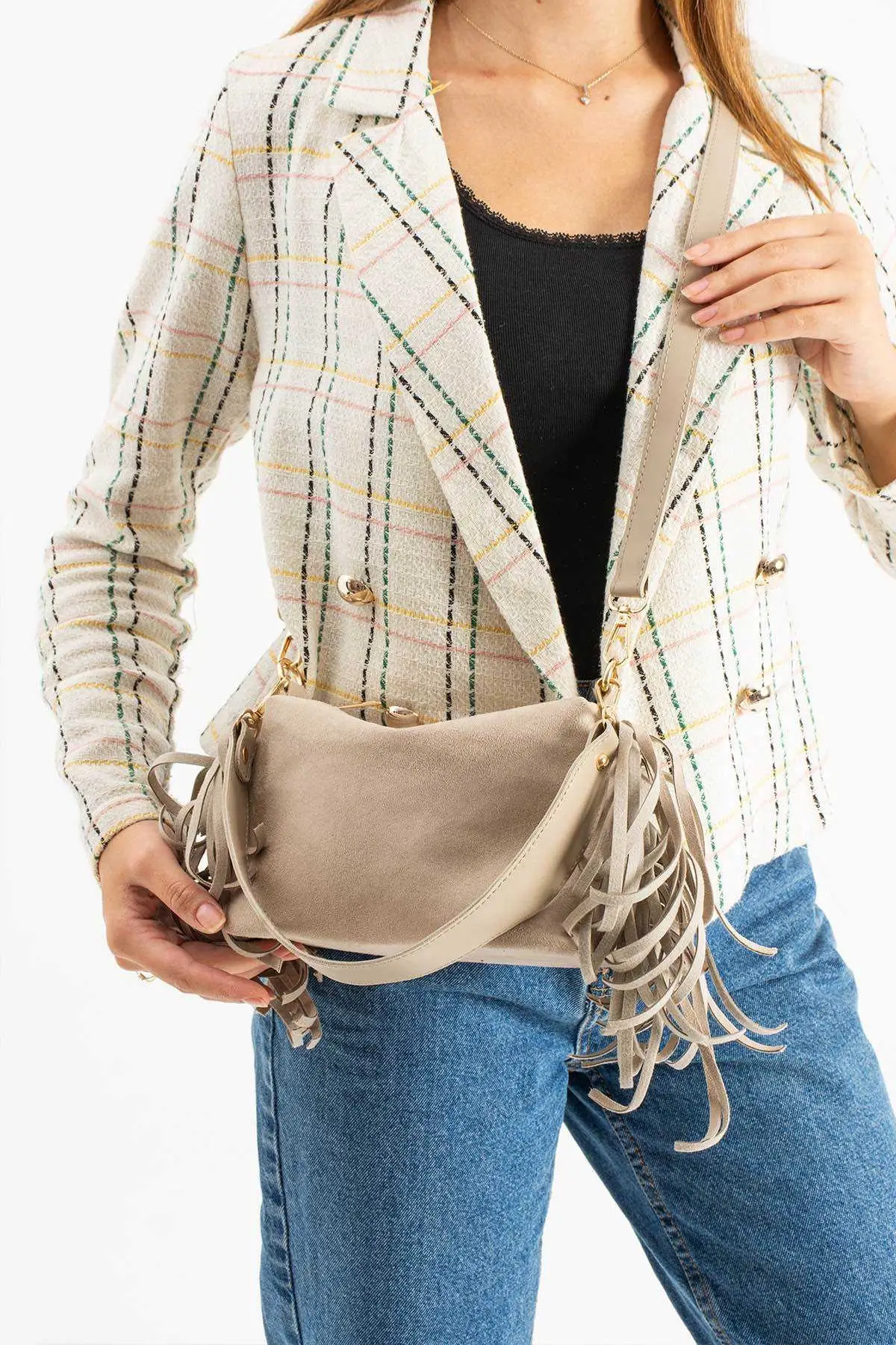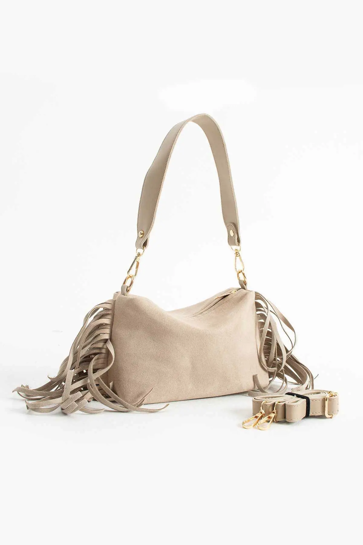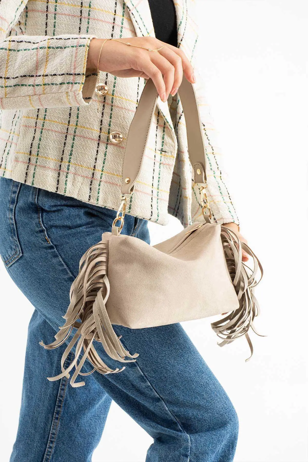 Sauve Vizon Süet Püskül Detaylı Fermuar Kapamalı Kadın Kol Ve Omuz Çantası