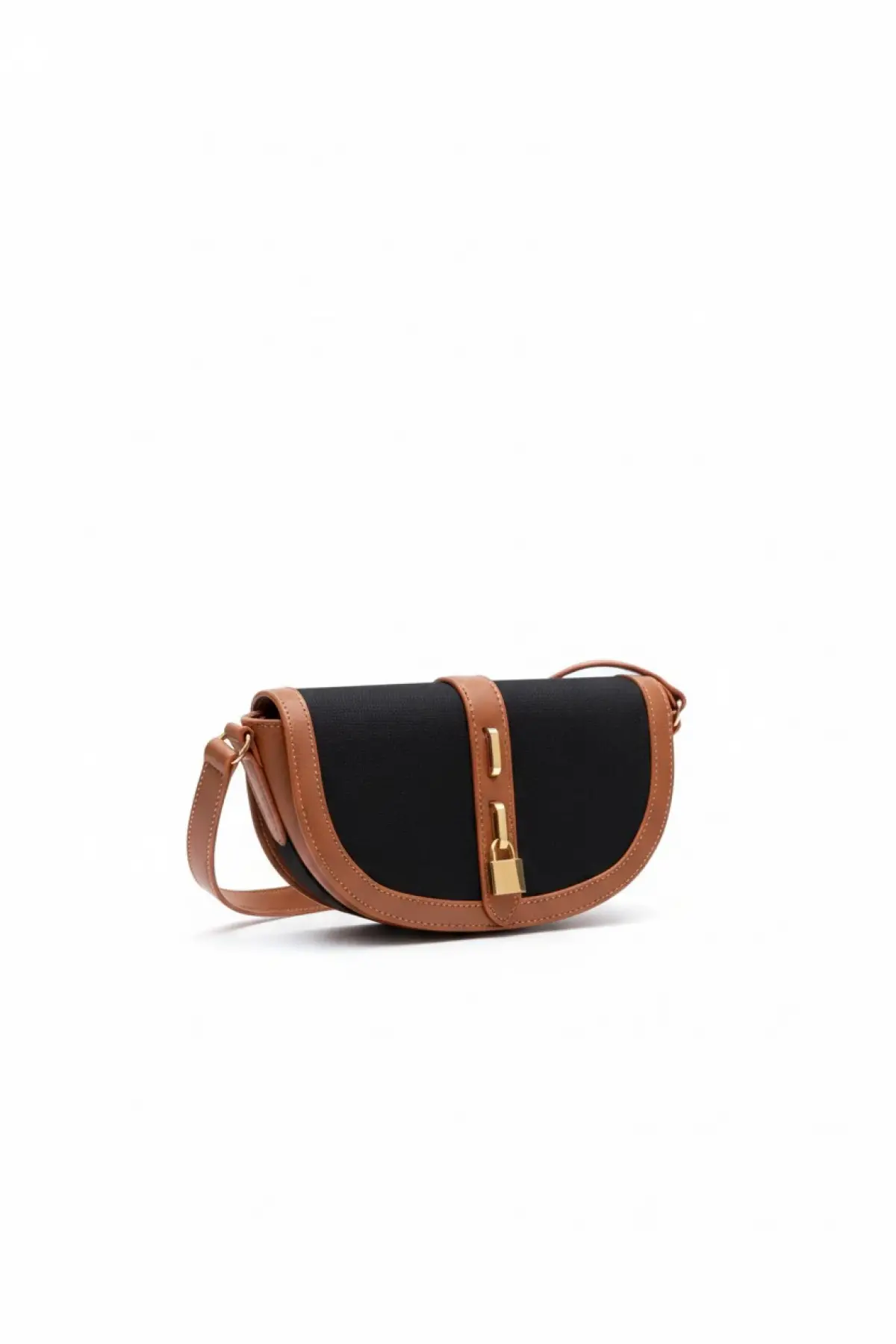 Stella Siyah-Taba Kilit Aksesuarlı Keten Deri Detaylı Çapraz Askılı Trend Kadın Omuz Çantası