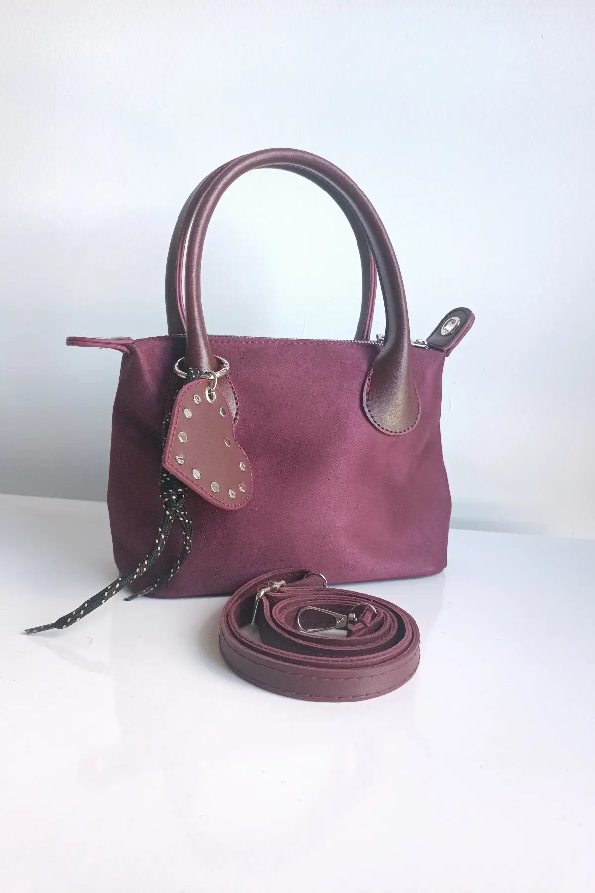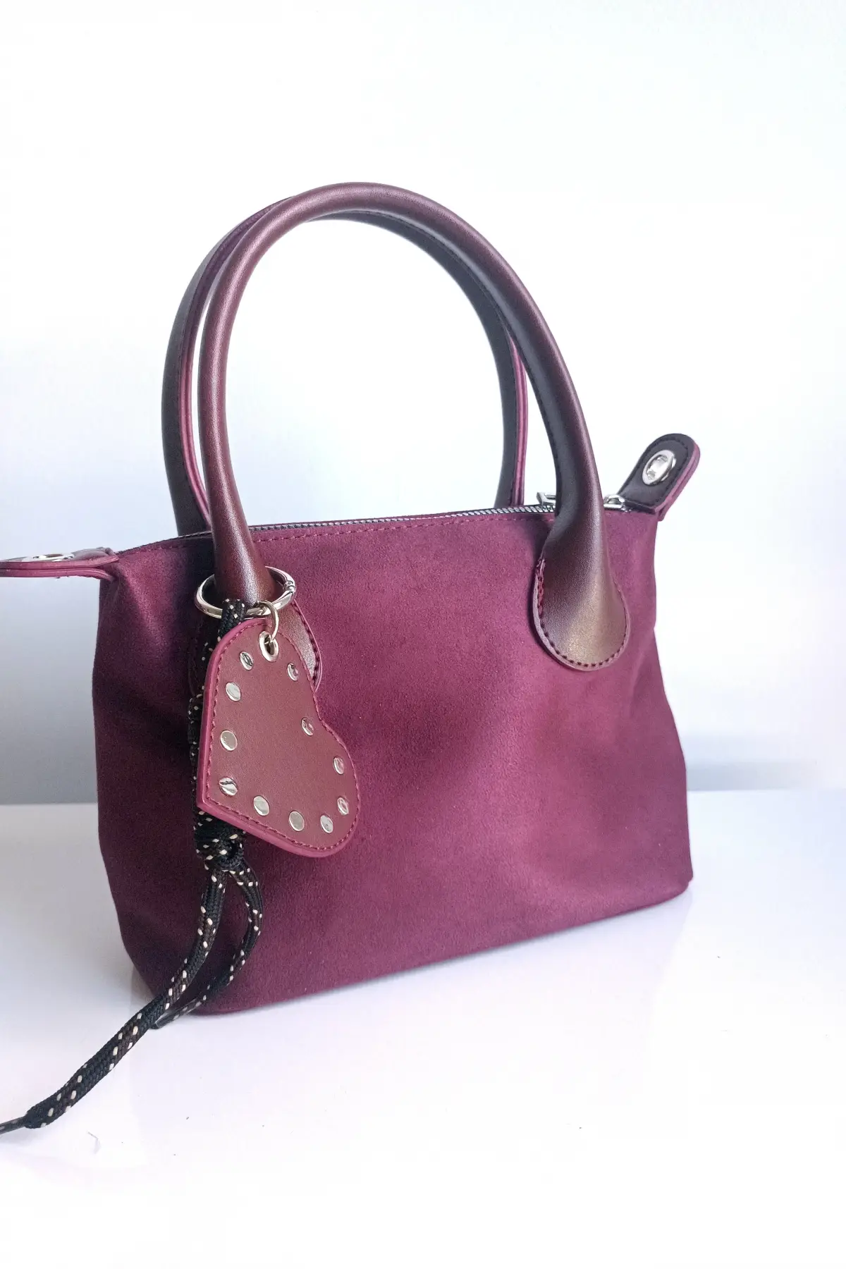 Tilda Bordo Süet Kalp Charm Detaylı Fermuarlı Kadın El Ve Omuz Çantası