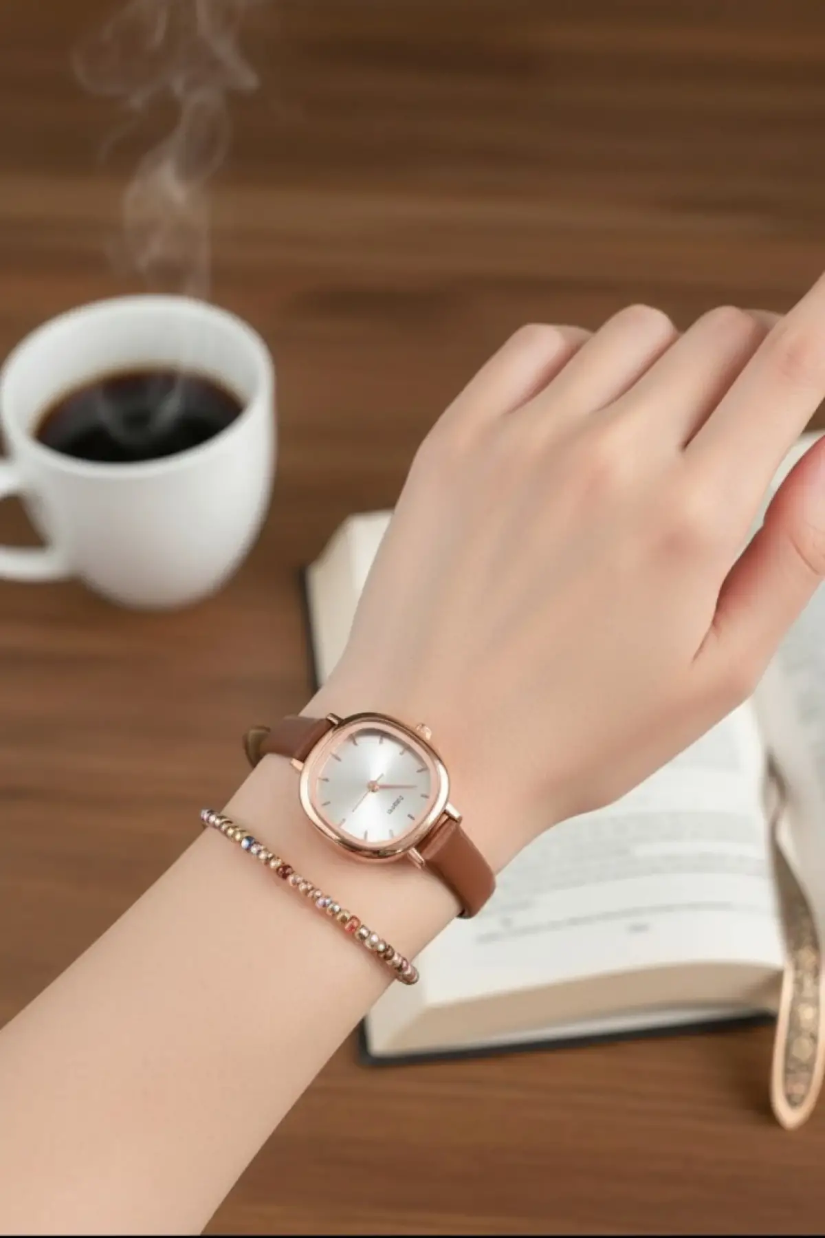 Pauline Kahve Cilt Deri Kahve Kadranlı Kordonlu Kare Minimal Kadın Kol Saati